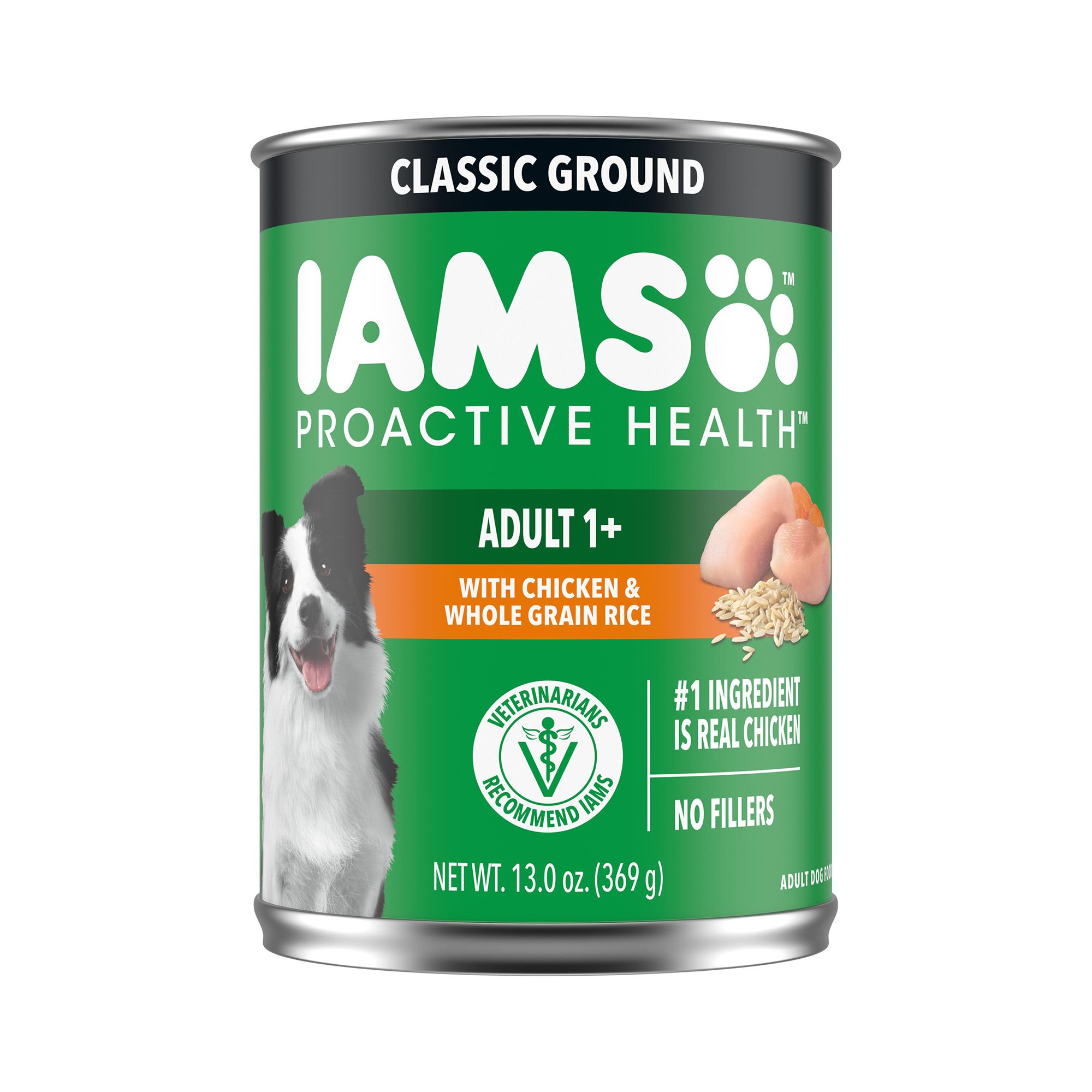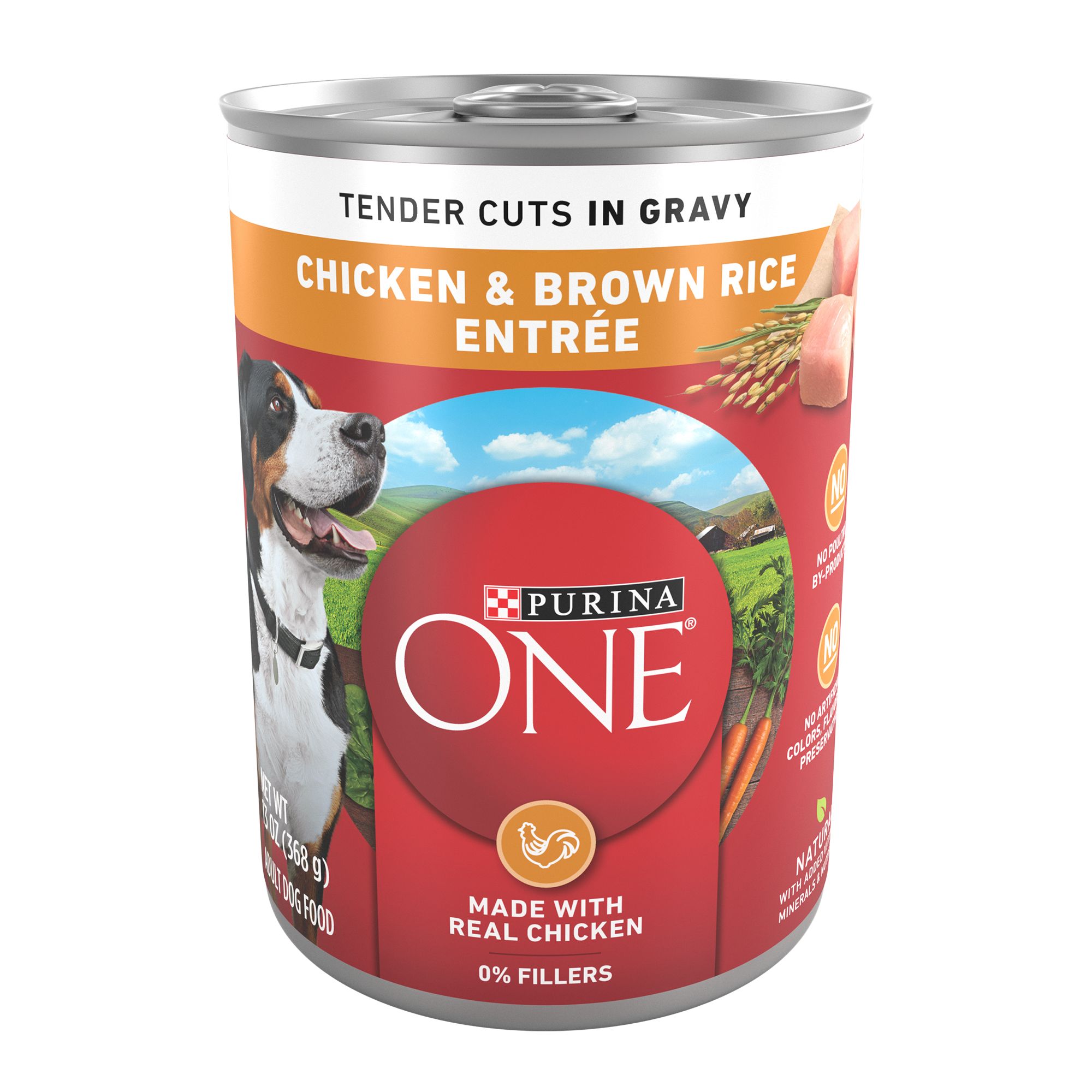 Satisfy your dog's cravings and give him the nutrition he needs with Purina ONE Classic Ground Chicken and Brown Rice Entree adult wet dog food. Real chicken is the first ingredient, along with brown rice and oatmeal for wholesome goodness. Because this adult dog food is made with 100 percent nutrition and 0 percent fillers, you can rest easy knowing that every high-quality ingredient has a purpose. This recipe is made with no poultry by-products and no corn, wheat or soy, so more nutrition goes to work inside your dog. Every serving of this soft dog food provides complete and balanced nutrition for adult dogs. This chicken and rice dog food recipe delivers the taste and texture dogs love, and the high protein helps to support your dog's strong muscles so he can maintain his active lifestyle. Make this Purina ONE natural dog food with added vitamins for dogs plus minerals and nutrients part of your canine's daily feeding routine.