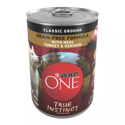 Feed your dog's instinct to choose nutrient-dense foods when you serve Purina ONE True Instinct Classic Ground Grain-Free Formula With Real Turkey and Venison natural with added vitamins, minerals and nutrients wet adult dog food. Real turkey is the number 1 ingredient in this canned dog food, along with real venison and other high-quality Purina ONE high protein dog food ingredients to help support strong muscles. The tender, meaty high protein dog food texture gives him something he can happily sink his teeth into, and the grain-free formula lets you feel good about the food you put into his bowl. We formulate this premium dog food without artificial colors, flavors or preservatives, no poultry by-products and 0 percent fillers, which means that each high-quality ingredient serves a purpose. Give your dog the nutritious soft dog food he deserves by serving Purina ONE True Instinct Classic Ground Formula With Real Turkey and Venison adult dog food today.