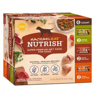 Give your dog the savory tastes they crave with the Rachael Ray Nutrish Savory Favorites Wet Dog Food Variety Pack. Each pack contains two (2) tubs of three (3) delicious flavors: Hearty Beef Stew, Chicken Paw Pie and Savory Lamb Stew. These mouthwatering stews are inspired by tasty recipes from Rachaelâs kitchen and made with simple, wholesome ingredients like tender meats and veggies. There are no corn, wheat, soy or gluten ingredients, and no artificial flavors or artificial preservatives. Just natural food for dogs with added essential vitamins and minerals for recipes your dog will love - and that you can feel good serving to them.