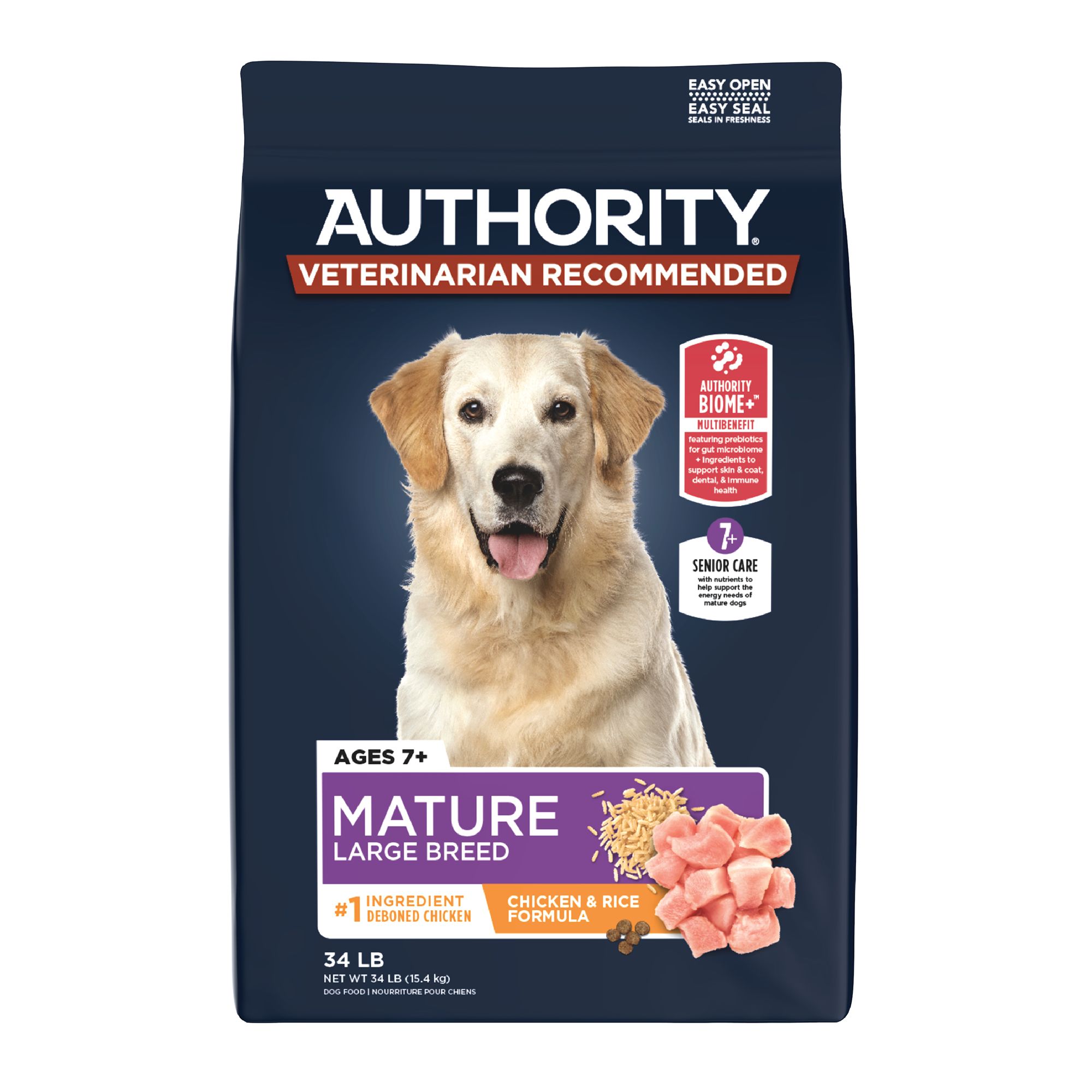 Authority® veterinarian recommended products reflect decades of research and experience, all aimed at delivering next-level nutrition. Which is key, because we believe that's the foundation for a healthy, active, rewarding life for your pet. Provide your dog with a delicious and nutritious mealtime choice by serving Authority® Chicken & Rice Formula Large Breed Puppy Dog Food. This formula features the Authority Biome+™ multibenefit blend of prebiotics for the gut microbiome, as well as ingredients that support skin & coat, dental, and immune health. Exclusively at PetSmart.
