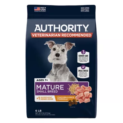 Authority® veterinarian recommended products reflect decades of research and experience, all aimed at delivering next-level nutrition. Which is key, because we believe that's the foundation for a healthy, active, rewarding life for your pet. Provide your dog with a delicious and nutritious mealtime choice by serving Authority® Chicken & Rice Formula Mature Small Breed Adult Dog Food. This formula features the Authority Biome+™ multibenefit blend of prebiotics for the gut microbiome, as well as ingredients that support skin & coat, dental, and immune health. Exclusively at PetSmart.