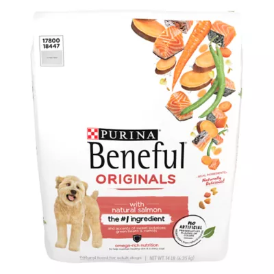 Get your dog's tail wagging at mealtime with Purina Beneful Originals With Natural Salmon adult dog food. We believe good food starts with good ingredients, and that's why our premium dog food kibble features a nutritious blend with natural salmon as the number 1 ingredient plus whole grains, accents of sweet potatoes, green beans and carrots. This wholesome dog food recipe offers 24g of protein for dogs per cup to support strong muscles and 23 essential vitamins for dogs and minerals to help support their overall health. Omega-rich nutrition helps maintain a shiny coat and healthy skin. Crafted with no artificial preservatives or flavors and added colors only from natural sources, Purina Beneful Originals with Natural Salmon offers a delicious flavor dogs love. Containing antioxidant vitamin E to provide immune support for dogs and a variety of high-quality ingredients, Purina Beneful dry salmon dog food delivers big flavor and 100 percent complete and balanced nutrition for adult dogs in every dog food bag.