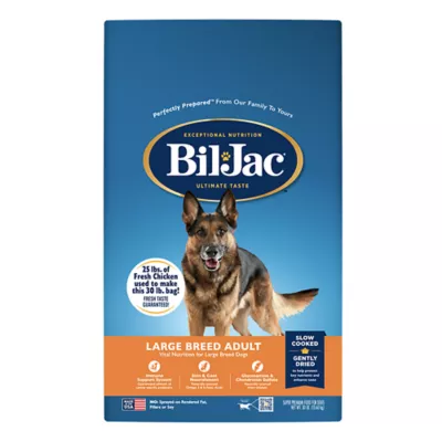 Proper nutrition is vital to the overall health of your large breed dog. Bil-Jac Large Breed Adult dry dog food is scientifically formulated to meet the needs of your big and beautiful breed. High-quality protein comes from the 25. lbs. of locally sourced, fresh chicken that is used to make a 30 lb. bag. The food is then slow cooked and gently dried to help protect key nutrients and enhance taste. Important for large breed dogs, this formula contains a guaranteed level of naturally sourced Glucosamine and Chondroitin Sulfate. Bil-Jac Large Breed Adult dry dog food also contains naturally sourced Omega 3 & 6 Fatty Acids to nourish skin and coat. Canine-specific probiotics help support your dog's everyday healthy digestion and immune health, making back yard clean-up easy with small, firm stools. With complete and balanced nutrition for fully grown large breed dogs, you can give your best friend nutrition they will thrive on and a taste they will love.