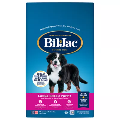 Maximize your large breed puppy's potential with the foundational nutrition of Bil-Jac Large Breed Puppy dry dog food. Bil-Jac starts with fresh, locally sourced chicken as the #1 ingredient to help your growing puppy build strong and lean muscles with this high-quality protein. The unique way this dry food is made allows for 25 lbs. of fresh chicken to be used to make each 30 lb. bag. Slow cooked and gently dried to lock in the taste of the fresh chicken and the nutrients needed, this formula supports a large breed puppy's critical first year of growth. Bil-Jac Large Breed Puppy dry dog food contains guaranteed amounts of canine-specific probiotics that will help support your large breed puppy's healthy digestion, immune health and make backyard clean-up easy. Naturally Sourced Omega 3 & 6 Fatty Acids will help your puppy have a shiny, lush coat. Scientifically formulated with naturally sourced Glucosamine and Chondroitin Sulfate. Start your newest family member off right with this complete and balanced diet.