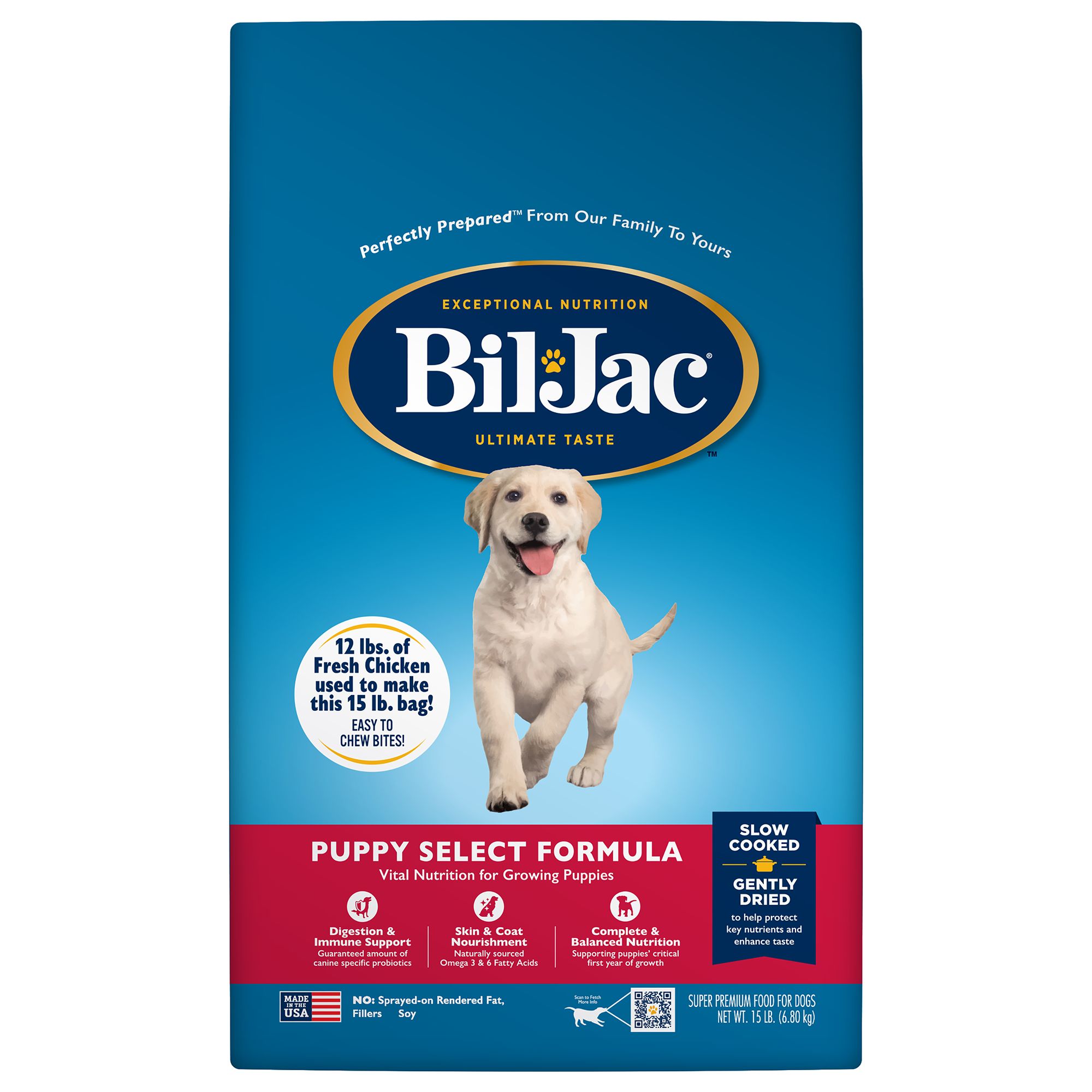 Maximize your dog's potential with nutrition they can thrive on. Bil-Jac Adult Select dry dog food is scientifically formulated to provide the vital nutrition needed to help your dog thrive. With guaranteed amounts of canine-specific probiotics to help support healthy digestion, back yard clean-up will be quick and easy. Featuring fresh, locally sourced chicken as the #1 ingredient to provide high-quality protein and help support lean muscle tone. The unique way this food is made allows Bil-Jac to use 25 lbs. of fresh chicken to make each 30 lb. bag. By slow cooking and gently drying the food, it helps protect the essential nutrients for your dog's nutritional benefit. Naturally sourced Omega 3 & 6 Fatty Acids will help your dog have a lush, shiny coat. In addition to adult dogs, Bil-Jac Adult Select dry dog food is formulated for puppies and senior dogs of all breed sizes. Complete and balanced nutrition that supports the everyday health of all the dogs in your family.