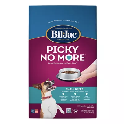 Small, toy, and miniature dogs are well-known to be some of the pickiest canines in the world when it comes to dinner time. Bil-Jac Picky No More Small Breed dry dog food has been specially designed to help solve that age old problem. This dry food formula brings excitement to every meal with a taste that even the pickiest small breed dogs crave. Formulated with fresh, locally sourced chicken and chicken liver for an irresistible taste they will love and high-quality protein to help support lean muscle. Dogs get excited about the real chicken liver in Bil-Jac treats, and now with Picky No More they will lick their bowl clean at dinner time. The tantalizing aroma triggers a healthy appetite in the pickiest of dogs. Naturally sourced Omega 3 & 6 Fatty Acids will help your dog have a lush, shiny coat. Canine-specific probiotics help support healthy digestion and immune function for easy backyard clean-up. With complete and balanced nutrition, this formula is perfect for the everyday health and wellness of picky small breed dogs.