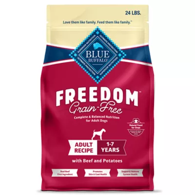 BLUE Freedom Grain-Free Adult Dry Dog Food is made with beef as the first ingredient, plus antioxidant-rich fruits and vegetables for truly balanced nutrition. This wellness dog food is free from grains that contain gluten, which some Pet Parents choose to avoid. It's also formulated with an optimal balance of Omega 3 & 6 fatty acids to promote a shiny coat and healthy skin. And like all Blue Buffalo dog food recipes, this dog food contains no chicken (or poultry) by-product meals. It's also free from corn, wheat, and soy.