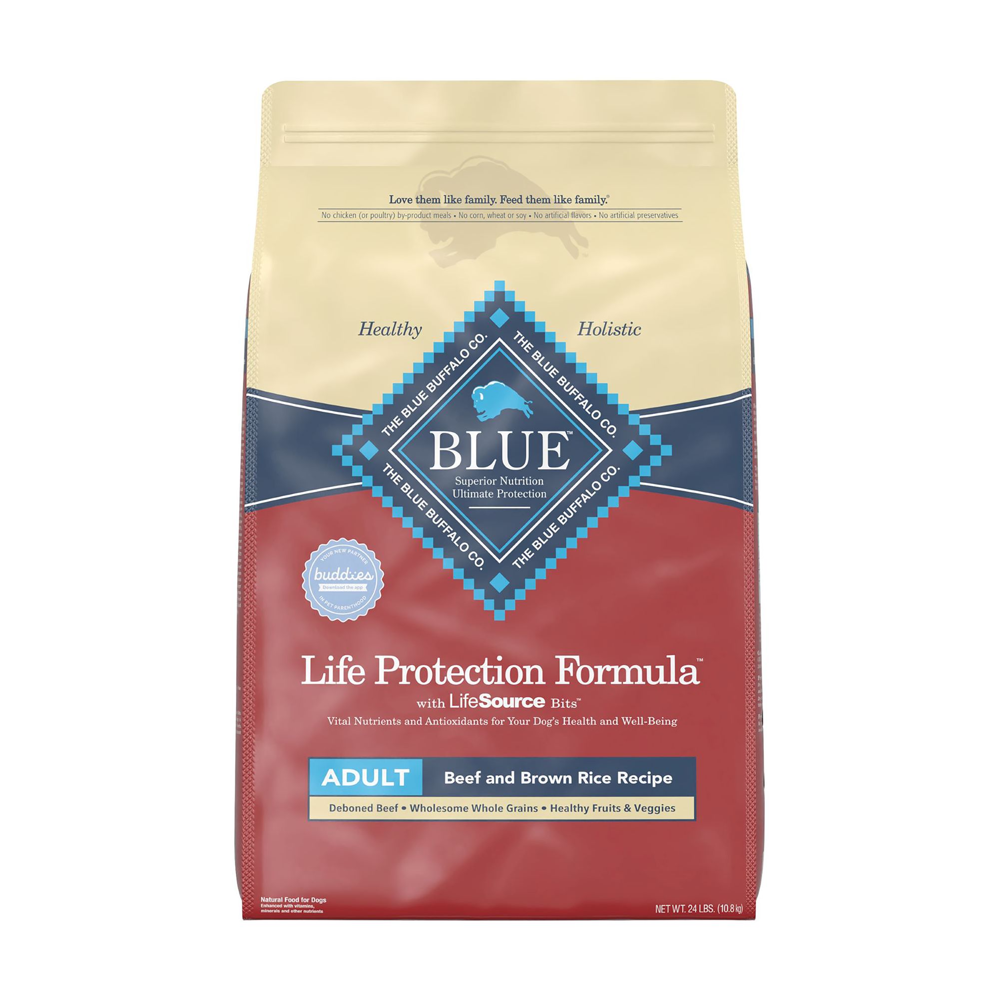 Formulated for the health and well-being of adult dogs, BLUE Life Protection Formula Chicken and Brown Rice dry dog food is made with the finest natural ingredients enhanced with vitamins, minerals, and other nutrients. It's a high-quality, balanced recipe you can both feel great about. Designed to help your dog thrive, this formula starts with real chicken and contains no chicken (or poultry) by-product meals, no corn, wheat, or soy, and no artificial flavors or preservatives. Like all BLUE dry foods, BLUE Life Protection Formula includes exclusive, antioxidant-rich LifeSource Bits to support a healthy immune system in your adult dog. Give your dog the balanced nutrition of BLUE Life Protection Formula today.BLUE Life Protection Formula is brought to you by Blue Buffalo, the leader in natural pet food. Blue Buffalo makes premium-quality pet foods featuring real meat, fruit, and vegetables. Love them like family. Feed them like family.