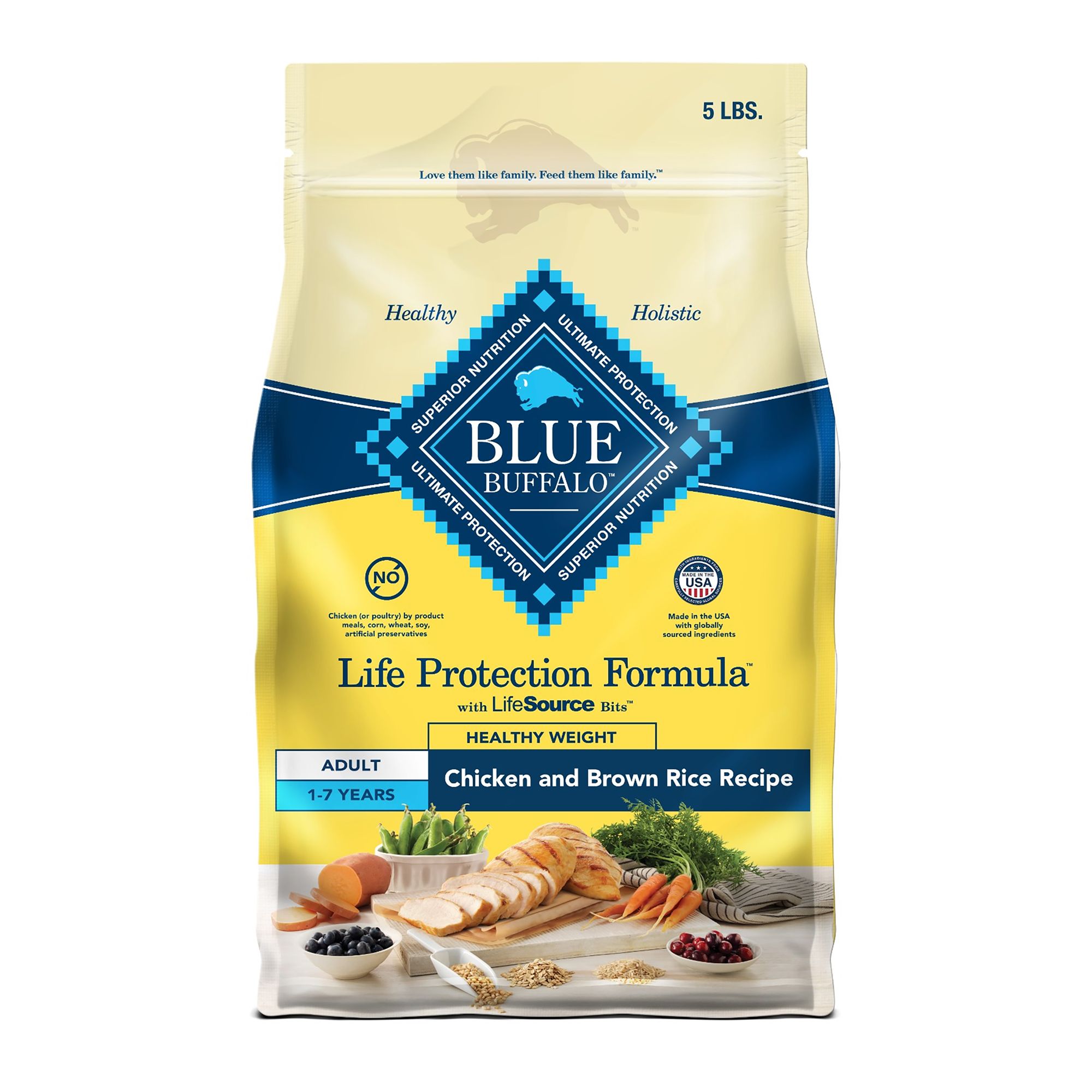 Because the nutritional requirements for senior dogs are different from other life stages, BLUE Life Protection Formula Chicken and Brown Rice Senior dry dog food is made with the ingredients to support your dog's overall health and well-being. It's a high-quality, balanced recipe you can both feel great about. With real chicken first and ingredients enhanced with vitamins, minerals, and other nutrients, BLUE Life Protection formula is designed to help your dog thrive. Formulated specifically for senior dogs, this diet contains Glucosamine and Chondroitin to support joint and hip health for overall mobility. Like all BLUE dry foods, BLUE Life Protection Formula includes exclusive antioxidant-rich LifeSource Bits, which are cold-formed to retain their potency. Give your dog the balanced nutrition of BLUE Life Protection Formula today. BLUE Life Protection Formula is brought to you by Blue Buffalo, the leader in natural pet food. Blue Buffalo makes premium-quality pet foods featuring real meat, fruit, and vegetables. Love them like family. Feed them like family.