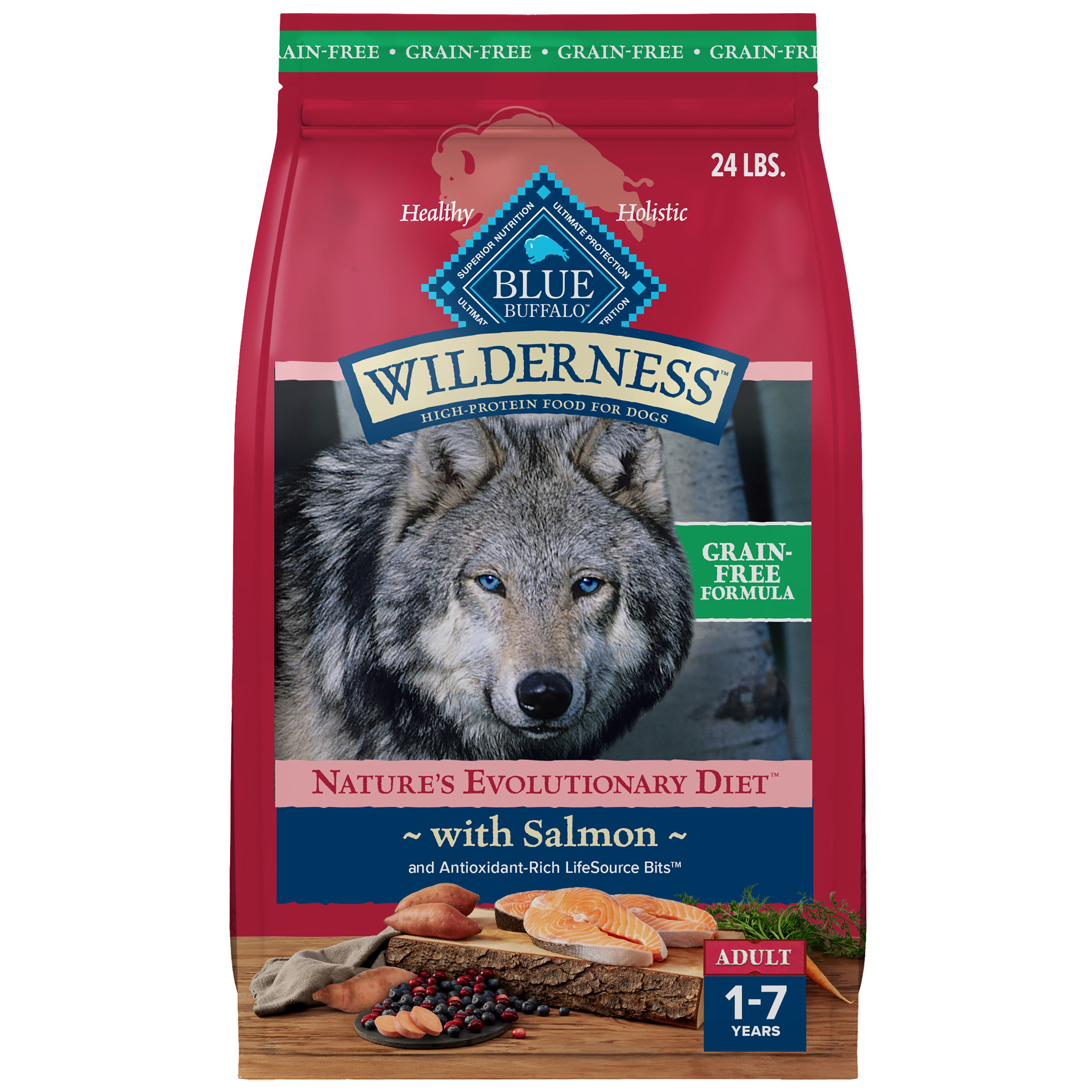 Like their ancestors before them, dogs were born to love meat. That's why BLUE Wilderness high-protein dog food is packed with the meat dogs crave. With delicious real chicken as the first ingredient, Blue Buffalo Wilderness Natural Grain-Free Dry Food for Adult Dogs, Chicken Recipe provides natural, balanced nutrition to help your dog thrive while satisfying their wild side. This protein-rich, grain-free formula contains fats, complex carbohydrates, fruits, and vegetables for wholesome, well-rounded nutrition without the grains some Pet Parents choose to avoid. High-quality protein from deboned chicken helps your dog maintain strong, healthy, lean muscles. BLUE Wilderness dog foods are backed by the True BLUE Promise and always start with real, high-quality meat, poultry, or fish. They contain no chicken or poultry by-product meals, no corn, wheat, or soy, and no artificial flavors or preservatives. BLUE Wilderness is brought to you by Blue Buffalo, the leader in natural pet food. Love them like family. Feed them like family.