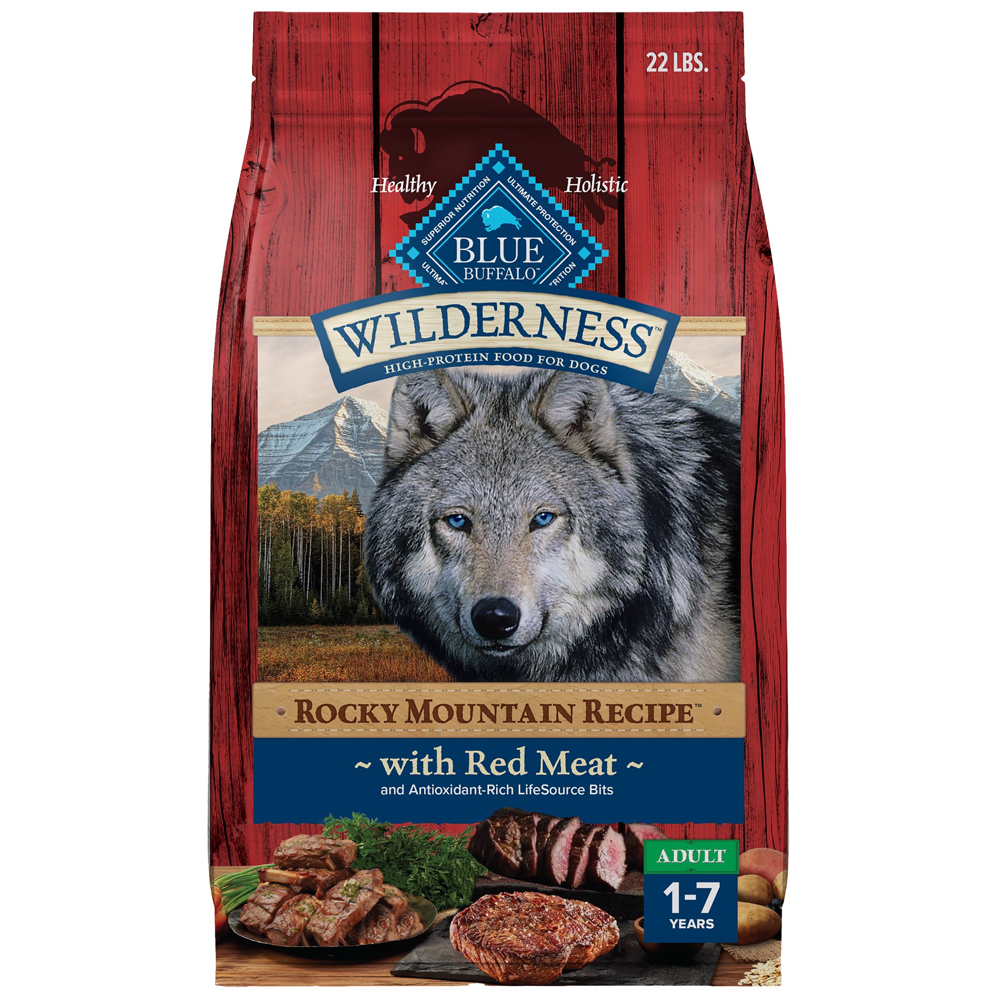 Feed your puppy's wild side with BLUE Wilderness Rocky Mountain Recipe Dry Puppy Food. The first ingredient in this high-protein dog food is deboned beef. It's also made with savory venison and lamb to help develop strong muscles. This puppy dog food with real meat features DHA and ARA for brain and eye development. BLUE Wilderness natural dog food is formulated without any chicken (or poultry) by-product meals. It is also free of corn, wheat, soy, artificial flavors, and preservatives. You can feel great knowing Blue Buffalo is helping your puppy thrive with a protein-packed diet.