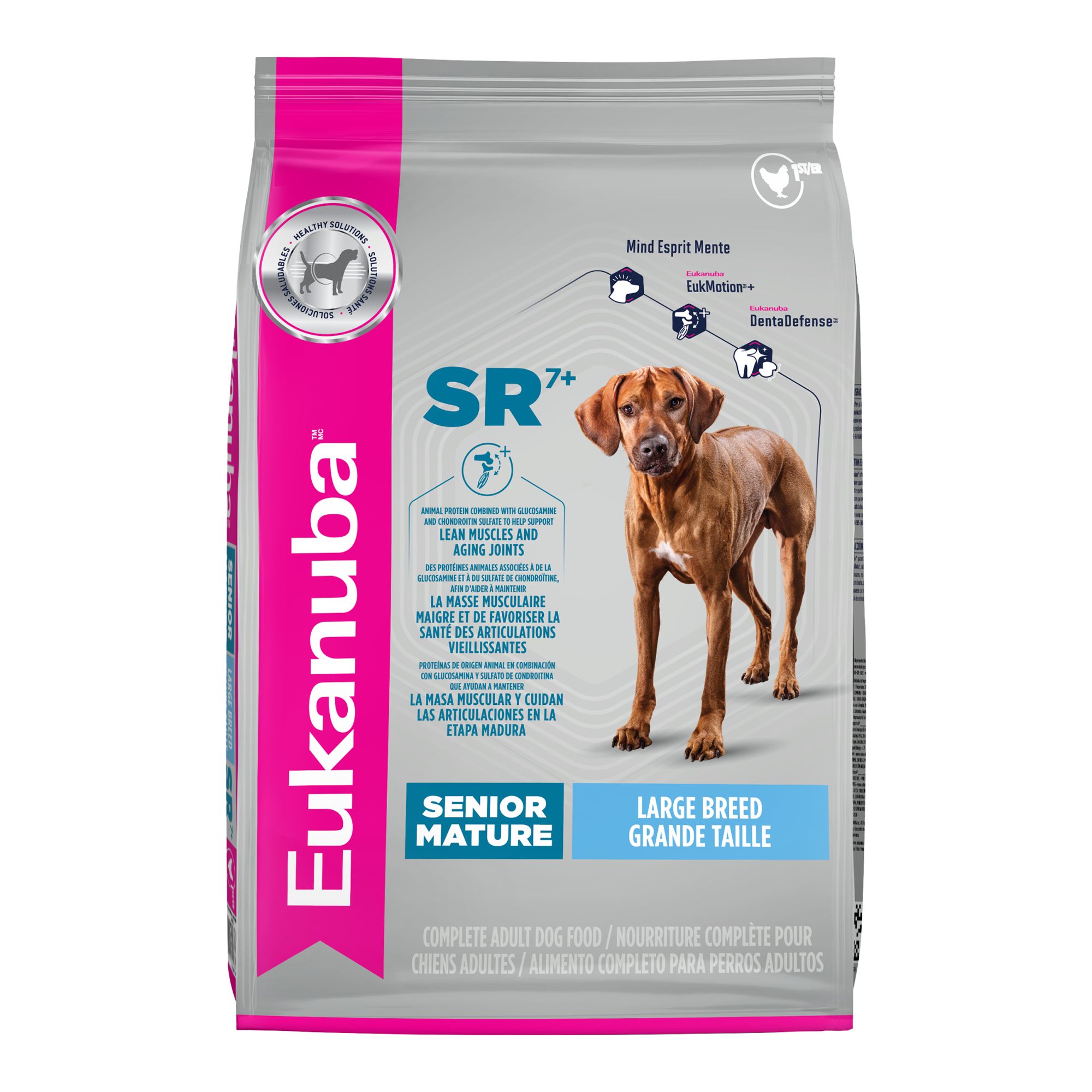 Features & Benefits: Eukanuba Adult Large Breed Dry Dog Food delivers complete and balanced adult dog food that's tailored for large breed dogs over 15 months old and weighing more than 55 lbs– Supports lean muscle in large dogs with high–quality animal protein and real chicken as the first ingredient, while glucosamine and chondroitin support healthy mobility– This dry dog food for large breeds features vitamin E to help support immunity, and a natural fiber and prebiotic blend help support digestion– Targeted levels of fats and carbohydrates help fuel daily activity needs of large breed dogs– Crunchy S–shaped kibble promotes chewing to help reduce tartar build–up
