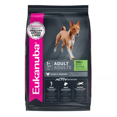 Features & Benefits: Eukanuba Small Bites Dog Food Dry Formula for dogs over 12 months old and up to 54 lbs. High–quality animal protein for dogs helps support lean muscles and agile joints in active dogs. Small Bites dry dog food with DHA and vitamin E helps support healthy brain function. Fat and carbohydrate levels provide concentrated energy beneficial for active dogs. High–quality chicken in this crunchy dog kibble for levels of protein to power an active lifestyle.