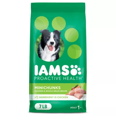Formulated to meet the nutritional needs of adult dogs, IAMS PROACTIVE HEALTH MINICHUNKS Chicken and Whole Grain dry dog food will keep your dog healthy and happy.