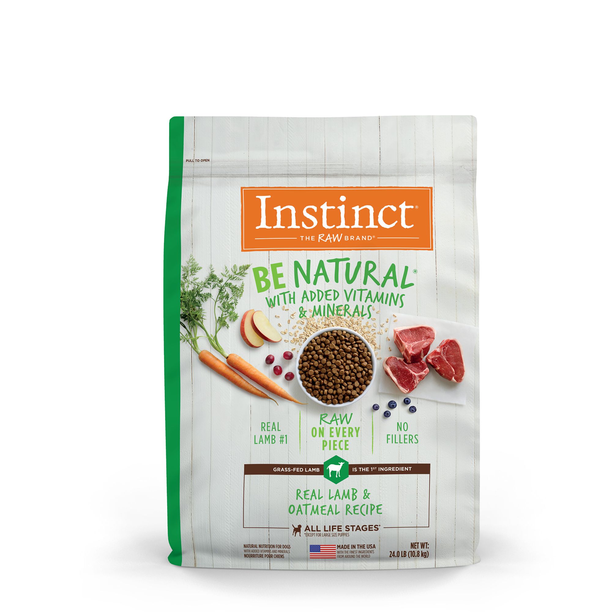 Natural nutrition begins here. Instinct Be Natural Real Chicken & Brown Rice Recipe starts with cage-free chicken and never contains filler, corn, wheat, soy or by-product meals or artificial preservatives and colors. Guided by our belief in the power of raw, each piece is tumbled with crushed freeze-dried raw chicken - raising the bar in nutrition and taste. Instinct Be Natural Real Chicken & Brown Rice Recipe is formulated to meet the nutritional levels established by the AAFCO Dog Food Nutrient Profiles for all life stages except for growth of large size dogs (70 lbs or more as an adult). All Instinct products are 100% Satisfaction Guaranteed. If you or your pet are not completely satisfied with this or any Instinct product, simply return the unused portion, along with the original sales receipt, to the retailer for a complete refund or replacement.