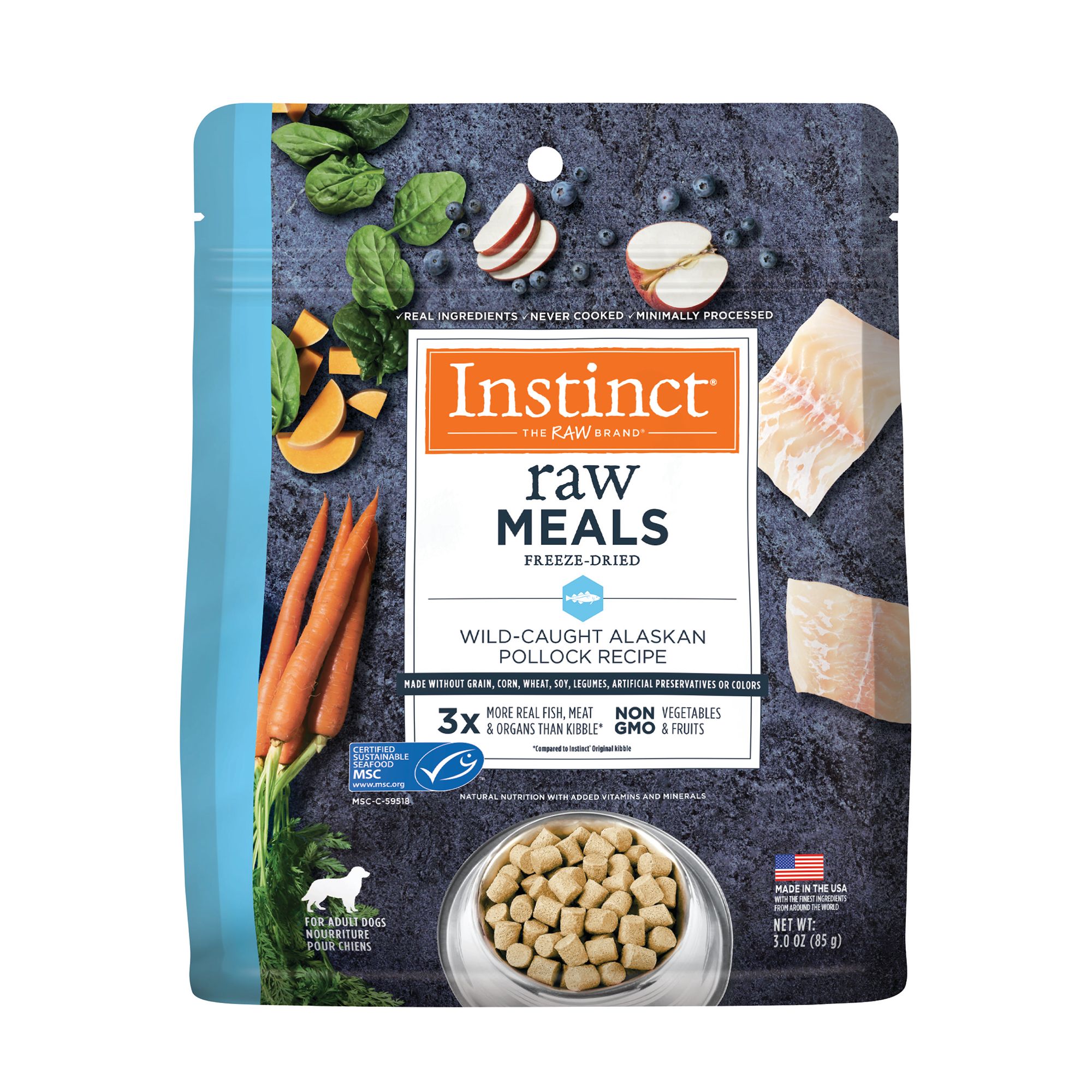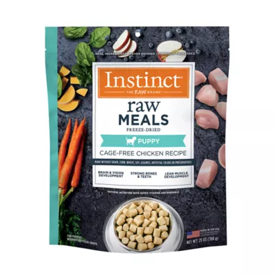 Upgrade your puppy's bowl from kibble to freeze-dried raw. Instinct Raw Freeze-Dried Meals for Puppies is protein packed with cage-free chicken and organs and non-GMO vegetables, fruits + vitamins & minerals. Made without grain, corn, wheat, soy, legumes, artificial colors or preservatives. Instinct Raw Freeze-Dried Meals Cage-Free Chicken Recipe for Puppies is formulated to meet the nutritional levels established by the AAFCO Dog Food Nutrient Profiles for growth except for growth of large size dogs (70 lbs or more as an adult). All Instinct products are 100% Satisfaction Guaranteed. If you or your pet are not completely satisfied with this or any Instinct product, simply return the unused portion, along with the original sales receipt, to the retailer for a complete refund or replacement.