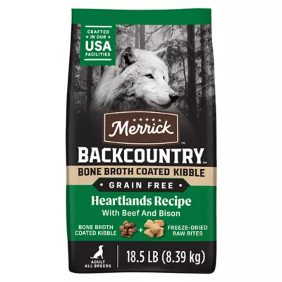 Key Benefits: Merrick Backcountry Dog Food recipe including beef and bison in bone broth coated kibble plus freeze-dried raw bites, Real deboned beef is the first ingredient in this high-protein dog food formulated to maintain healthy muscles and energy levels, with added vitamins, minerals and nutrients, Wholesome grain-free dog food recipe features a holistic blend to deliver the nutritional benefits of an ancestral diet, Premium dry dog food formula containing high levels of omega-3 and omega-6 fatty acids to nourish skin and coat and glucosamine and chondroitin to support hips and joints, This premium dog kibble with beef and bison is specially formulated to meet your dog's dietary needs with no artificial preservatives or flavors and is crafted in USA facilities, Spoil your pet with Purina products. Reward yourself with points on every purchase. Download the myPurina app today.