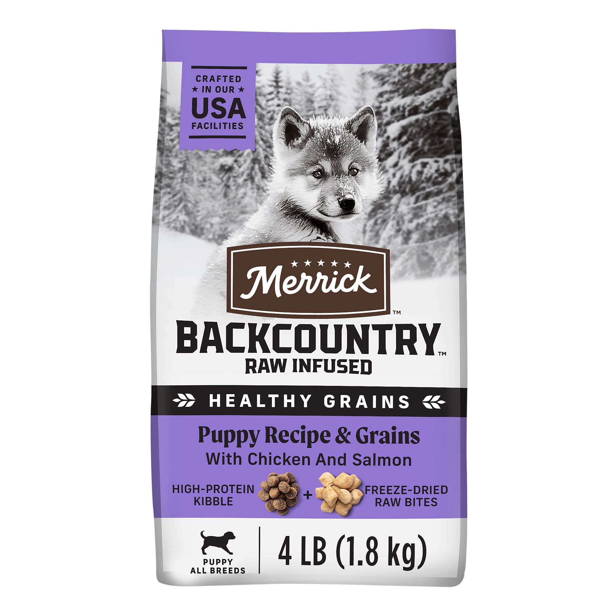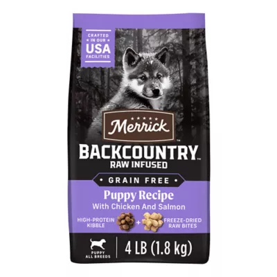 Features & Benefits: Merrick Backcountry Grain Free Puppy Food Recipe. Gluten Free Dry Puppy Dog Food Kibble with Freeze Dried Raw Pieces, Real deboned chicken is the first ingredient in this high protein dog food formulated for puppies to help developing healthy muscles and energy levels, with added vitamins, minerals and nutrients, Wholesome grain free dry puppy food recipe features a holistic blend of kibble and real freeze dried raw bites to deliver the nutritional benefits of an ancestral diet, Premium formula contains high levels of omega–6 and omega–3 fatty acids to nourish skin and coat, with glucosamine and chondroitin to support hips and joint, This premium kibble is natural with added vitamins, minerals, and nutrients to support your puppy's healthy growth and development. Proudly founded in Hereford, Texas, crafted in USA facilities