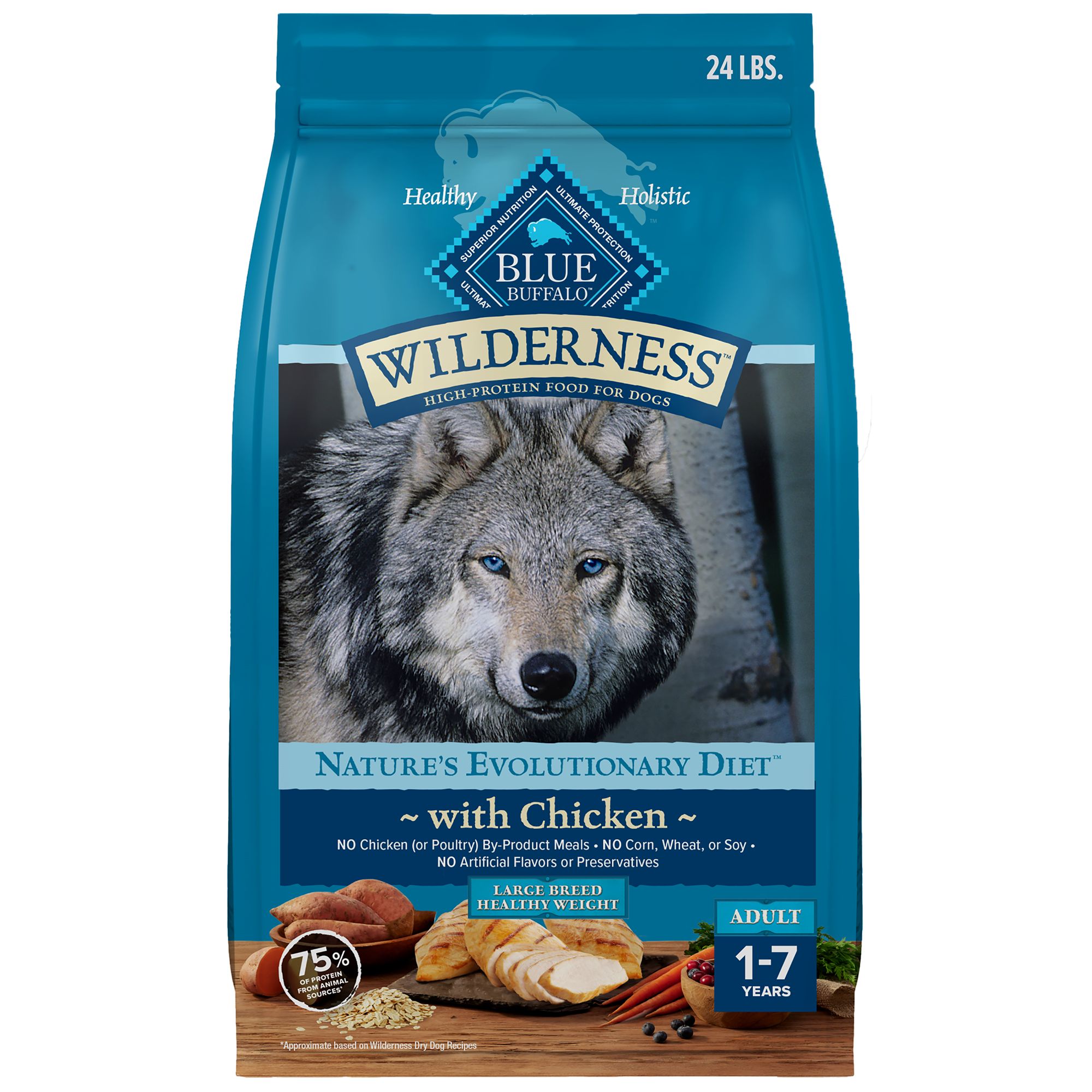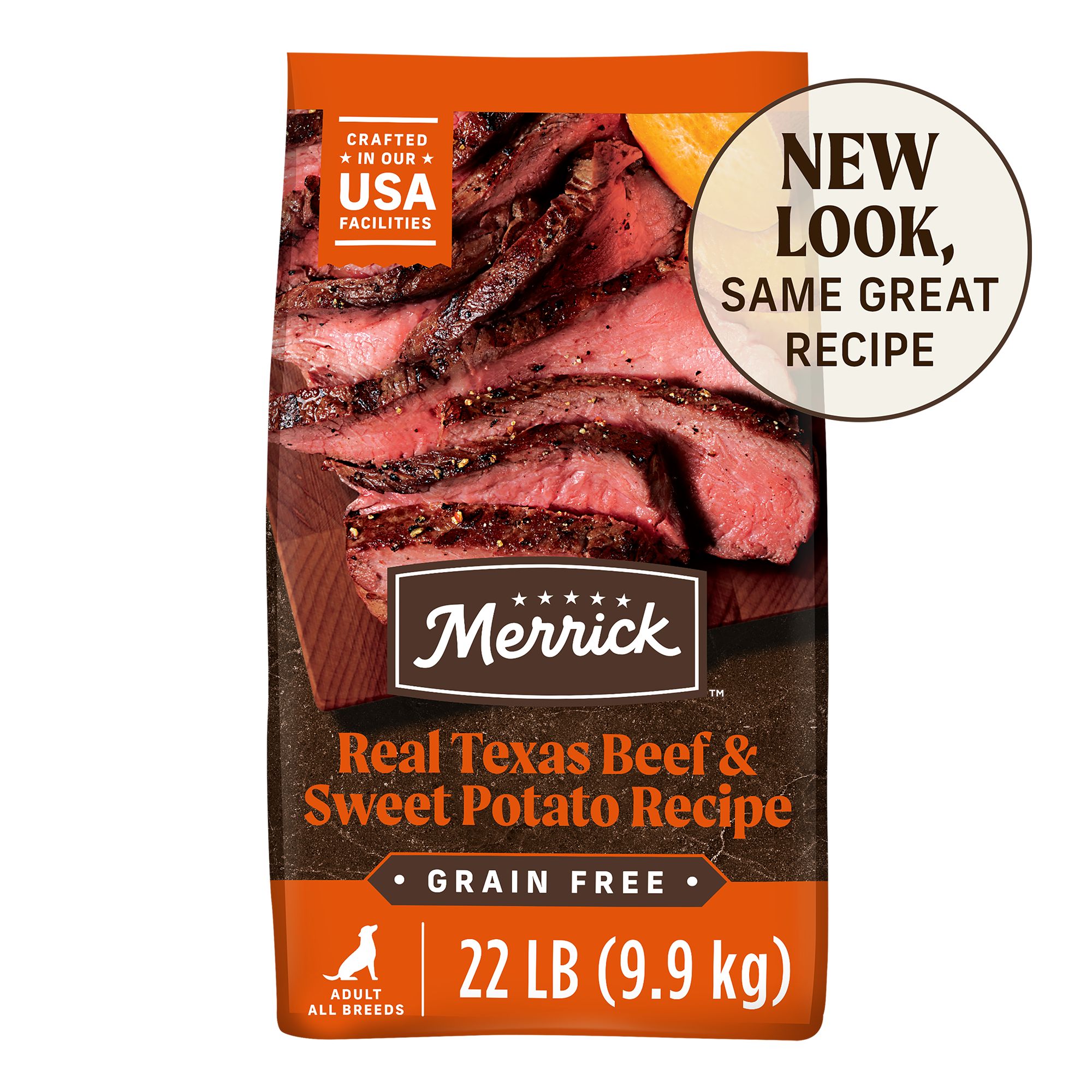 Merrick Large Breed Dry Dog Food Real Chicken and Sweet Potato Grain Free Dog Food Recipe is crafted with whole foods and deboned chicken as the first ingredient in this real meat dog food. This Merrick grain free dog food provides high-quality protein to help build and maintain healthy muscle tissue and energy levels for large breed adult dogs. With 60% protein and healthy fat ingredients and 40% produce, fiber, vitamins, minerals and other natural ingredients, this complete and balanced natural dog food is rich in protein and fiber. Leading levels of omega fatty acids in this adult dog food help support your dog's healthy skin and coat. This high protein dog food helps maintain healthy hips and joints by providing leading levels of glucosamine and chondroitin for dogs. This grain free dry dog food contains no corn, wheat, soy, gluten or artificial preservatives. Merrick dog food is crafted in our Hereford, TX kitchen.