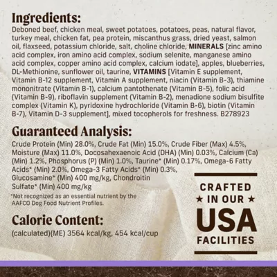 Merrick Dry Puppy Food Real Beef and Sweet Potato Grain Free Dog Food Recipe is crafted with whole foods and deboned beef as the first ingredient in this real meat dog food. This Merrick grain free puppy food provides high-quality protein to help build and maintain healthy muscle tissue and energy levels for all breeds. With 55% protein and healthy fat ingredients and 45% produce, fiber, vitamins, minerals and other natural ingredients, this complete and balanced natural dog food is rich in protein and fiber. This grain free puppy food has DHA to support healthy brain development and smaller sized kibble. Leading levels of omega fatty acids help support healthy skin and coat. This high protein dog food helps maintain healthy hips and joints by providing leading levels of glucosamine and chondroitin for dogs. This grain free dry dog food contains no corn, wheat, soy, gluten or artificial preservatives. Merrick dog food is crafted in our Hereford, TX kitchen.