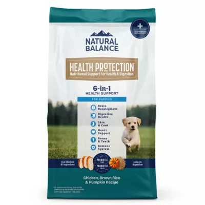 Key Benefits: "#1 INGREDIENT IS REAL CHICKEN: Real chicken is always the first ingredient in our dry dog food with chicken to provide a good source of highly digestible protein. 6-IN-1 HEALTH BENEFITS: Brain Development, Digestive Health, Skin & Coat, Heart Support, Bones & Teeth and Immune System. With multiple health focuses, Natural Balance Health Protection offers whole body health puppy food. EASY ON DIGESTION: Each bite contains natural prebiotic fiber & is coated in probiotics to support puppy digestive wellness & a healthy microbiome. Gentle ingredients like brown rice & pumpkin for dogs provide healthy fiber for puppy food easy on digestion. NATURAL INGREDIENTS: Our healthy puppy food is made with natural ingredients and added vitamins and minerals to provide whole health dog food. Recipes are made without corn, soy, wheat, or animal by-product meal ingredients and no artificial colors or flavors. VITAMINS, MINERALS, AND NUTRIENTS: Rich in Omega 3 & 6 fatty acids to support healthy skin & shiny coat and Vitamin E to support a healthy immune system. Naturally occurring Glucosamine and Chondroitin support healthy joints. Calcium and Phosphorus support strong bones and teeth in this chicken dog food.