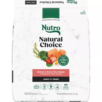 Supports Healthy Skin & Coat: This dry dog food is formulated with an optimal ratio of Omega-3 and Omega-6 Fatty Acids to nourish sensitive skin for a soft shiny coat guaranteed in 25 days, 100%, satisfaction guaranteed or your money back.Supports Healthy Digestion: Nutro Natural Choice Adult Dry Dog Food, Salmon & Brown Rice Recipe is made with natural fiber for healthy digestion.Healthy Immunity: This natural dog food has guaranteed levels of antioxidants like Vitamin E and Selenium to promote healthy immunity.Supports Whole Body Health: Nutro Natural Choice Adult Dry Dog Food is a nutrient–rich recipe made with essential nutrients and antioxidants to support whole body health.Salmon #1 Ingredient: This dry dog food recipe is made with salmon as the #1 ingredient, bringing a familiar flavor your dog will love.Wholesome Ingredients: Nutro Natural Choice Adult Dry Dog Food is made without corn, wheat, or soy products, making it a healthy choice.Contains: Contains one (1) 28 lb. bag of Nutro Natural Choice Adult Dry Dog Food, Salmon & Brown Rice Recipe.Species: Dog