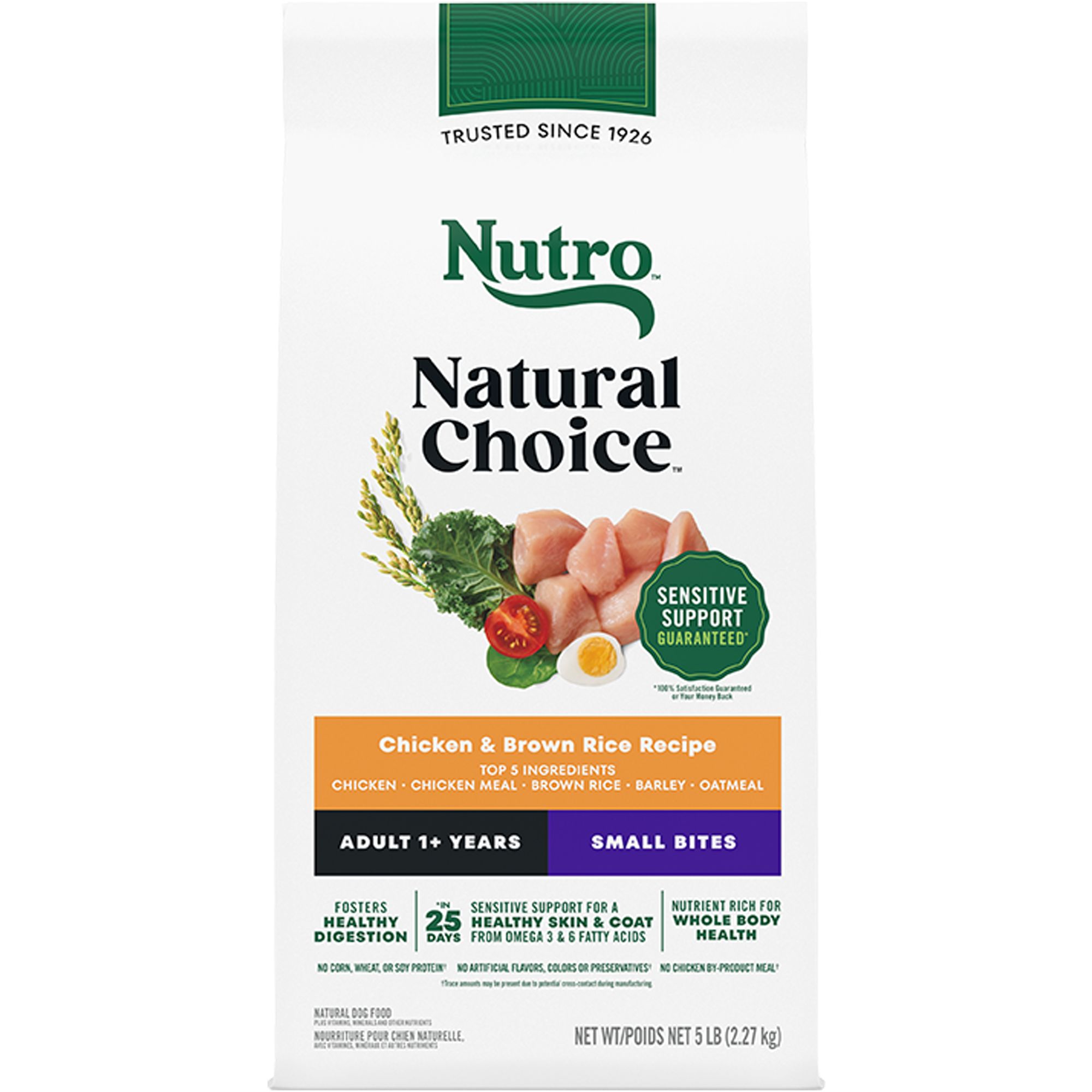 Supports Healthy Skin & Coat: Nutro Natural Choice Adult Small Bites Dog Food is formulated with an optimal ratio of Omega–3 and Omega–6 Fatty Acids to nourish sensitive skin for a soft shiny coat guaranteed in 25 days, 100% satisfaction guaranteed or your money back.Digestive Health Support: Nutro Natural Choice Adult Small Bites Dog Food Recipe is made with natural fiber for healthy digestion.Healthy Immunity: This dry dog food has guaranteed levels of antioxidants like Vitamin E and Selenium to promote healthy immunity.Quality Ingredients: This Nutro Natural Choice dry dog food recipe is made with no corn, wheat, or soy, although trace amounts may be present due to potential cross–contact during manufacturing.Lamb #1 Ingredient: This dry dog food recipe is made with real lamb as the #1 ingredient, bringing a familiar flavor your dog will love.Supports Whole Body Health: Nutro Natural Choice Adult Small Bites Dog Food is a nutrient–rich recipe made with essential nutrients and antioxidants to support whole body health.Contains: Contains one (1) 5 lb. bag of Nutro Natural Choice Adult Small Bites Dog Food, Lamb & Brown Rice Recipe.Species: Dog
