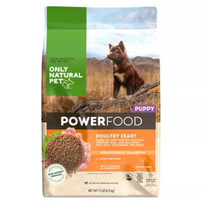 Only Natural Pet Powerfood Puppy Poultry Feast is a delicious blend of high protein chicken and chicken meal, and is balanced with real vegetables and fruit for your growing puppy. Our thoughtful process puts pets before profits with a focus on quality nutrition and care for our pets and our planet. We believe that what we leave out of our food and treats is just as important as what goes in. That's why we have a strict set of standards for our ingredients, ensuring we only use the best. Only at PetSmart.