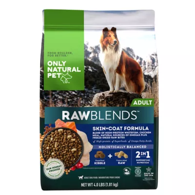 Only Natural Pet RawBlends Skin & Coat Formula is a holistically-balanced kibble that is a delicious blend of high protein whitefish, chicken meal with natural sources of omegas plus freeze-dried raw bites. Our thoughtful process puts pets before profits with a focus on quality nutrition and care for our pets and our planet. We believe that what we leave out of our food and treats is just as important as what goes in. That's why we have a strict set of standards for our ingredients, ensuring we only use the best. Only at PetSmart.