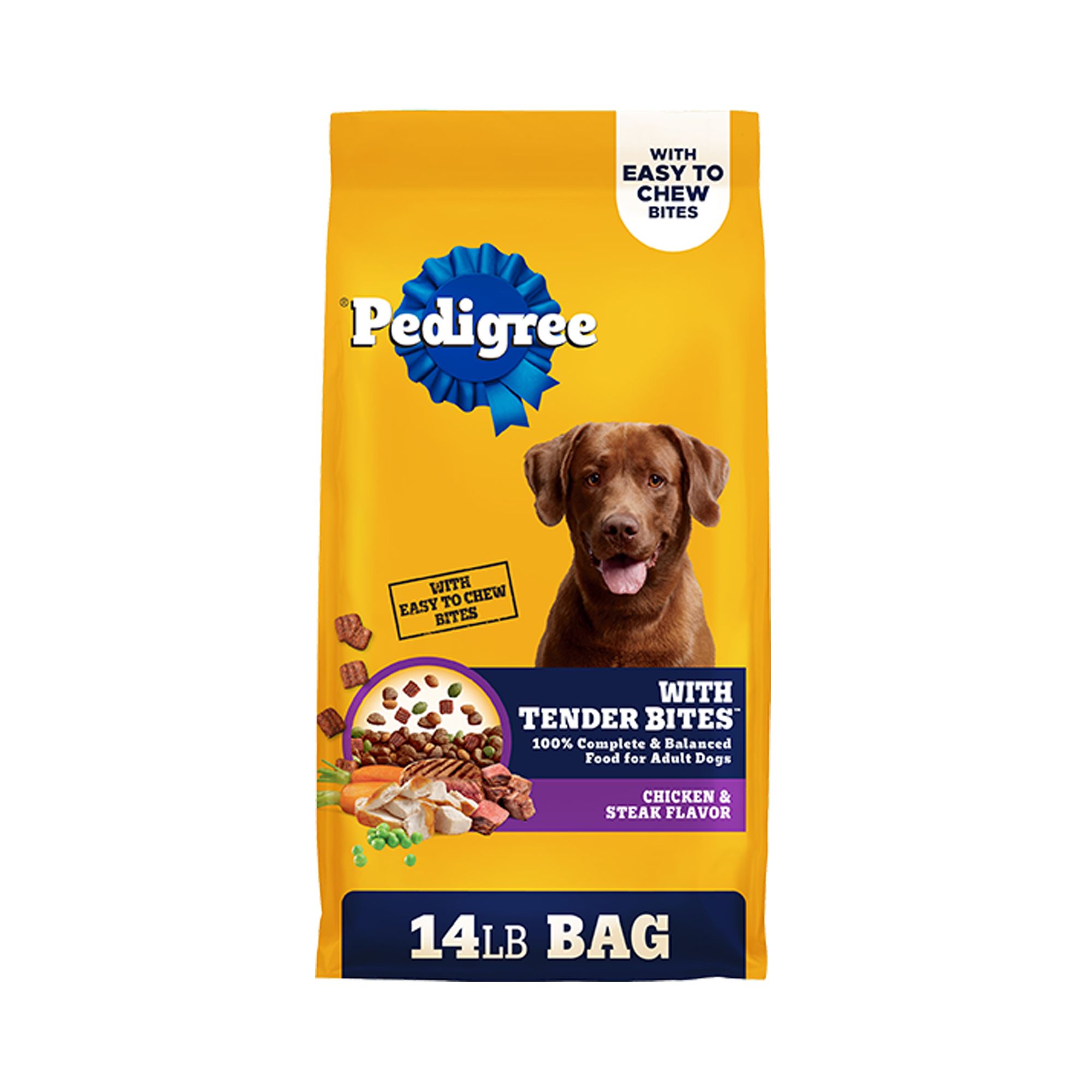 Complete and Balanced: Pedigree Adult Dry Dog Food Roasted Chicken & Vegetable Flavor With Bacon Flavored Bites is 100%, complete and balanced food for adult dogs, bringing a nutritious meal to your pet.Supports Everyday Health: This dry dog food recipe is made with 36 vitamins, minerals, and amino acids to support your dog's health and vitality.Bacon Bites: This dry dog food recipe is made with protein–rich bacon flavored bites which brings a delicious twist to mealtime.Highly Digestible Dog Food Recipe: Pedigree Adult Dry Dog Food Roasted Chicken & Vegetable Flavor With Bacon Flavored Bites is made with only natural flavors and includes prebiotic fibers to support healthy digestionSupports Healthy Skin and Coat: This dry dog food recipe is enriched with Omega 6 Fatty Acid and Zinc to help nourish a healthy skin and coat.Supports Immune Health: This dry dog food recipe fortified with vitamins & minerals to support a healthy immune system.Contains one (1) 18 lb. Bag of Pedigree Adult Dry Dog Food, Roasted Chicken and Vegetable Flavor With Bacon Flavored Bites.Species: Dog