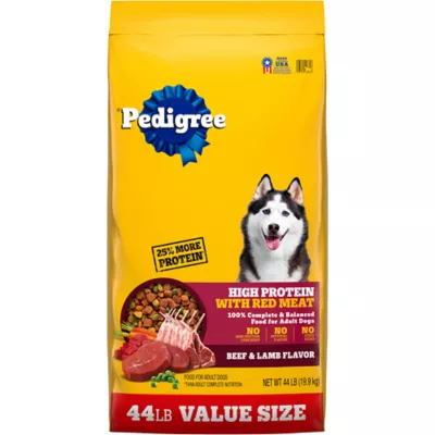 Complete and Balanced: Pedigree High Protein Adult Dry Dog Food is 100%, complete and balanced food for adult dogs, bringing a nutritious meal to your pet.Made With Real Meat: This dry dog food recipe is made with real red meat and 25%, more protein compared to Adult Complete Nutrition, giving your dog a familiar flavor they will love.Supports Everyday Health: This dry dog food recipe is made with 36 vitamins, minerals, and amino acids to support your dog's health and vitality.Highly Digestible Dog Food Recipe: Pedigree High Protein Adult Dry Dog Food is made with only natural flavors and includes prebiotic fibers to support healthy digestion.Supports Healthy Skin and Coat: This dry dog food recipe is enriched with Omega 6 Fatty Acid and Zinc to help nourish a healthy skin and coat.Supports Immune Health: This dry dog food recipe fortified with vitamins & minerals to support a healthy immune system.Contains one (1) 44 lb. Bag of Pedigree High Protein Adult Dry Dog Food, Beef and Lamb Flavor.Species: Dog