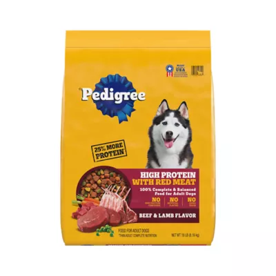 Complete and Balanced: Pedigree High Protein Adult Dry Dog Food is 100%, complete and balanced food for adult dogs, bringing a nutritious meal to your pet.Made With Real Meat: This dry dog food recipe is made with real red meat and 25%, more protein compared to Adult Complete Nutrition, giving your dog a familiar flavor they will love.Supports Everyday Health: This dry dog food recipe is made with 36 vitamins, minerals, and amino acids to support your dog's health and vitality.Highly Digestible Dog Food Recipe: Pedigree High Protein Adult Dry Dog Food is made with only natural flavors and includes prebiotic fibers to support healthy digestion.Supports Healthy Skin and Coat: This dry dog food recipe is enriched with Omega 6 Fatty Acid and Zinc to help nourish a healthy skin and coat.Supports Immune Health: This dry dog food recipe fortified with vitamins & minerals to support a healthy immune system.Contains one (1) 18 lb. Bag of Pedigree High Protein Adult Dry Dog Food, Beef and Lamb Flavor.Species: Dog