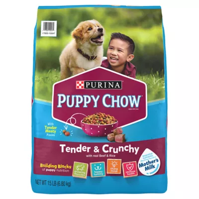 Give your growing puppy the texture and taste he deserves with Purina Puppy Chow Tender and Crunchy dry puppy food. Made with real beef, this high protein dry dog food for puppies is packed with 30 percent more protein than the leading adult dog food. The delicious combination of tender chunks and crunchy dog food kibble keeps him satisfied at mealtime, and you can be sure he's getting the nourishment he needs. Puppies have special nutritional needs, and this high protein puppy food helps you meet those needs. Every serving contains 100 percent essential nutrients, including DHA, which puppies need to give them a great foundation to build on. With all the nutrition he needs to develop big and strong, this dry puppy dog food recipe lets you feel confident every time you fill his bowl. Offer up this puppy dog kibble as part of his daily feeding regimen, and let the mix of flavor and texture satisfy his hunger as he matures into his active adult years. Purina Puppy Chow Tender and Crunchy puppy food provides the building blocks of puppy nutrition to help lay the foundation for a healthy, active life. With real beef, the Healthy Start blend provides high-quality protein along with DHA for brain and vision development and 100 percent of the essential nutrients for your puppy's first year.