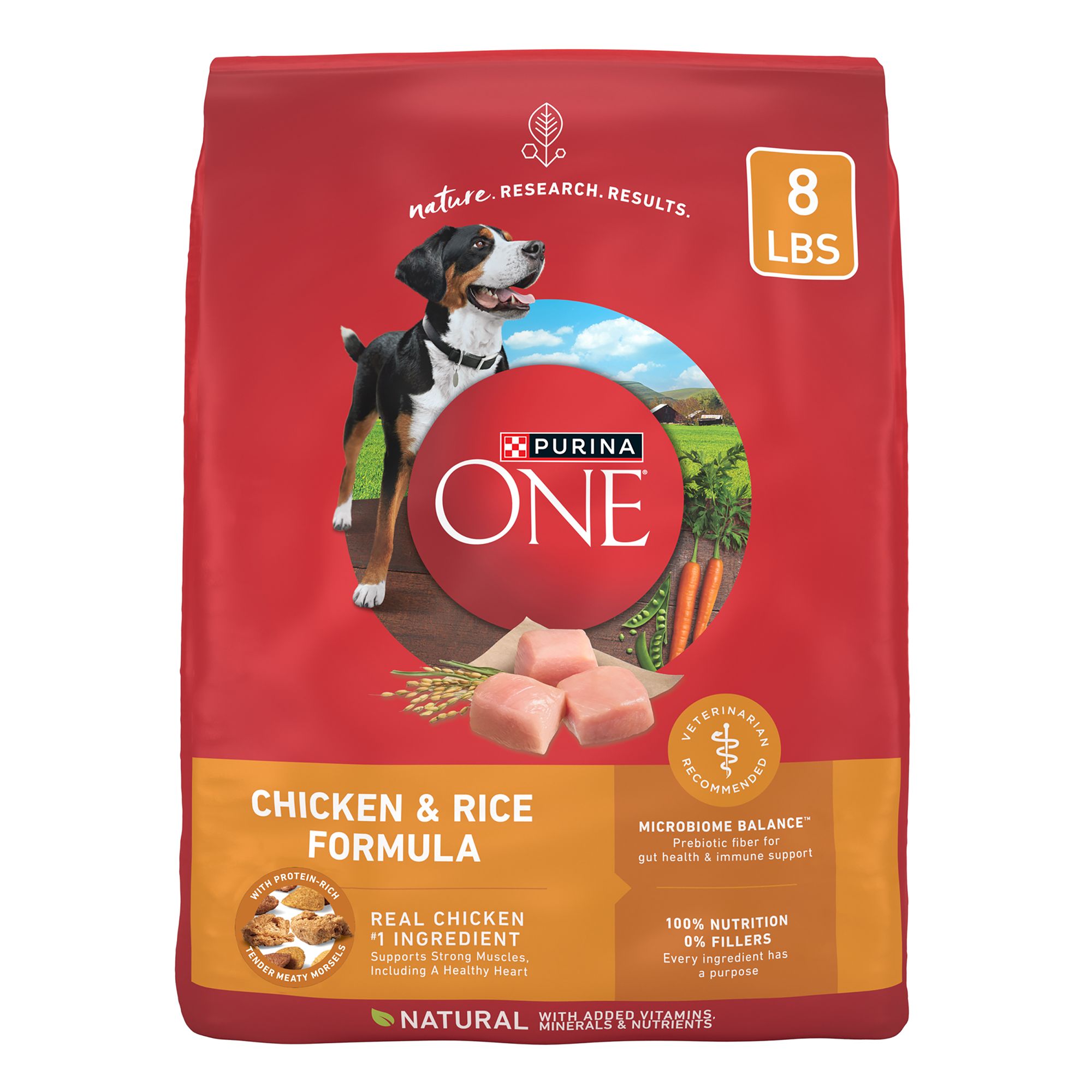 Features & Benefits: Real chicken is the number 1 ingredient in this adult dog food featuring protein-rich, tender, meaty morsels and crunchy dog kibble for a taste dogs love, Four antioxidant sources for immune support for dogs, while natural sources of glucosamine help to support healthy joints, Includes Omega-6 fatty acids, vitamins and minerals help to support a healthy skin and coat for dogs, 0 percent fillers mean all our high-quality Purina ONE dry dog food ingredients have a purpose, Highly digestible chicken and rice dog food with 100 percent complete and balanced nutrition, so more nutrition goes to work inside your dog, Spoil your pet with Purina products. Reward yourself with points on every purchase. Download the myPurina app today