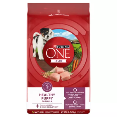 Your growing puppy has unique nutritional needs, so give them Purina ONE Plus Healthy Puppy Formula High Protein Natural Puppy Kibble, Plus Healthy Puppy Formula with added vitamins, minerals and nutrients. Each serving of this dog food for puppies includes DHA, a nutrient found in mothers' milk, to support vision and brain development and four antioxidant sources provide immune system support for dogs. Real chicken is the first ingredient in this high protein dog food for puppies delivering a flavor they'll crave and the protein they need for strong, growing muscles, including a healthy heart. This easily digestible Purina ONE dry dog food for puppies also features a SmartBlend of high-quality ingredients, including omega-6 fatty acids, puppy vitamins and minerals, for a shiny coat and healthy skin and glucosamine for dogs to support healthy hips and joints. Give your puppy 100 percent complete and balanced nutrition with no fillers, artificial flavors or preservatives by feeding them this Purina ONE Puppy Food.