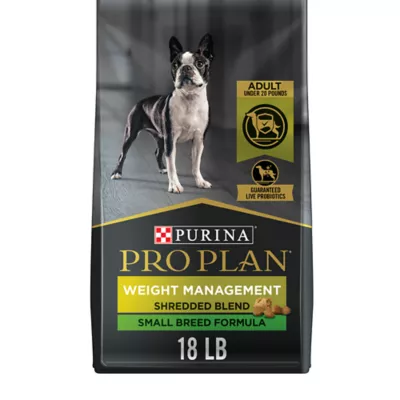 Provide the targeted support your small breed dog needs to achieve a healthy weight by feeding him Purina Pro Plan Small Breed Weight Management Shredded Blend Chicken and Rice Formula dry dog food. Real, high-quality chicken is the first ingredient in this kibble dog food, which features a high protein level to maintain lean muscle mass during weight loss. We fortify our weight control dog food with guaranteed live probiotics to support your dog's digestive and immune health, while natural prebiotic fiber nourishes specific intestinal bacteria for digestive health. Our small breed dry dog food contains calcium, phosphorus and other minerals to maintain his strong bones and teeth, and omega-6 fatty acids and vitamin A nourish your dog's skin and coat. The appealing combination of crunchy kibble and tender, shredded pieces provides delicious taste and texture without the use of artificial colors or flavors. Our formula provides 100 percent complete andbalanced nutrition to support his overall health. With 15 percent less fat than Purina Pro Plan Small Breed Shredded Blend Chicken and Rice Formula for adult dogs, this SPECIALIZED Small Breed Weight Management dog food formula helps your dog reach an ideal body condition. We proudly manufacture Pro Plan dry dog food at Purina-owned facilities for your peace of mind.