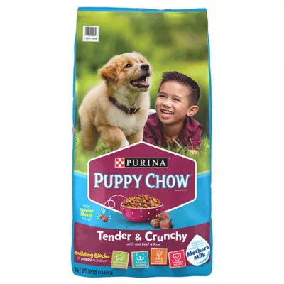 Give your growing puppy the texture and taste he deserves with Purina Puppy Chow Tender and Crunchy dry puppy food. Made with real beef, this high protein dry dog food for puppies is packed with 30 percent more protein than the leading adult dog food. The delicious combination of tender chunks and crunchy dog food kibble keeps him satisfied at mealtime, and you can be sure he's getting the nourishment he needs. Puppies have special nutritional needs, and this high protein puppy food helps you meet those needs. Every serving contains 100 percent essential nutrients, including DHA, which puppies need to give them a great foundation to build on. With all the nutrition he needs to develop big and strong, this dry puppy dog food recipe lets you feel confident every time you fill his bowl. Offer up this puppy dog kibble as part of his daily feeding regimen, and let the mix of flavor and texture satisfy his hunger as he matures into his active adult years. Purina Puppy Chow Tender and Crunchy puppy food provides the building blocks of puppy nutrition to help lay the foundation for a healthy, active life. With real beef, the Healthy Start blend provides high-quality protein along with DHA for brain and vision development and 100 percent of the essential nutrients for your puppy's first year.