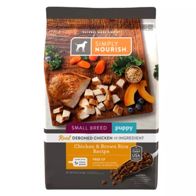 Simply Nourish Chicken & Brown Rice Recipe Small Breed Puppy Food is packed with nutrients such as natural sources of glucosamine & chondroitin to support hip & joint health and DHA to help support healthy brain & eye development. Feed your dog's well-being and support overall health with this delicious dry blend.