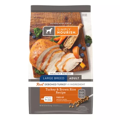Simply Nourish Turkey & Brown Rice Recipe Healthy Weight Large Breed Adult Dog Food supports the unique needs of large dogs with high quality, lean animal proteins and L-Carnitine to help support muscle mass while maintaining optimal body weight. Feed your dog's well-being with this delicious dry blend.