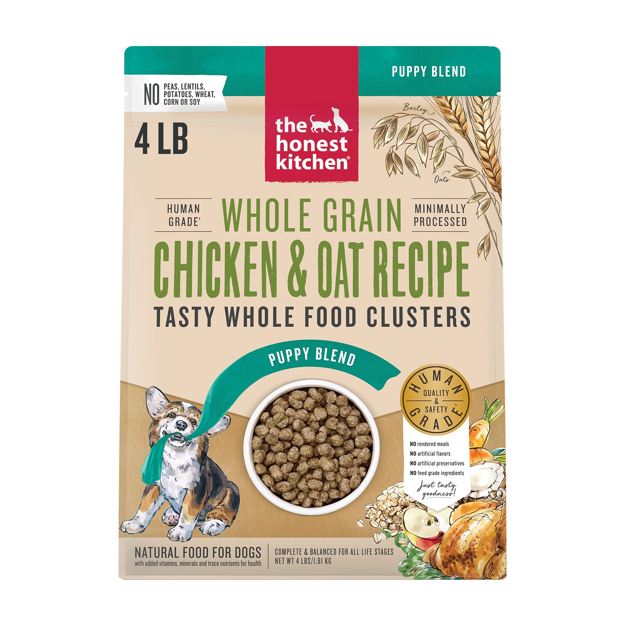 Description: The first human grade dry food that's been crafted specially for puppies! Too good to be called kibble, you can see and smell the real food ingredients in every golden, roasted bite of The Honest Kitchen's Whole Food Clusters. Crafted with a veterinary nutritionist to support the needs of growing puppies of all breeds (including large breeds), this healthy recipe has enhanced protein to support muscle development, DHA to support brain health and added probiotics to help support digestion. Even the pickiest pups love it! Serve as their main meal, pair with a healthy topper or use as tasty training treats.