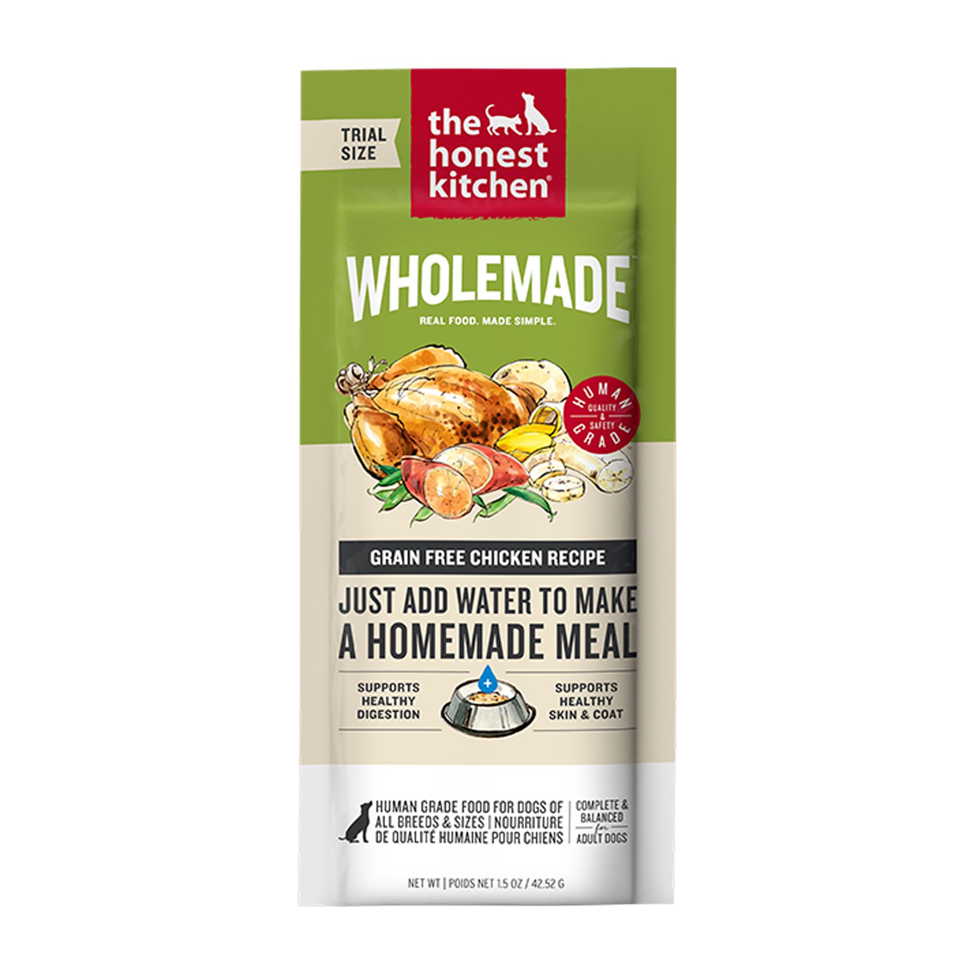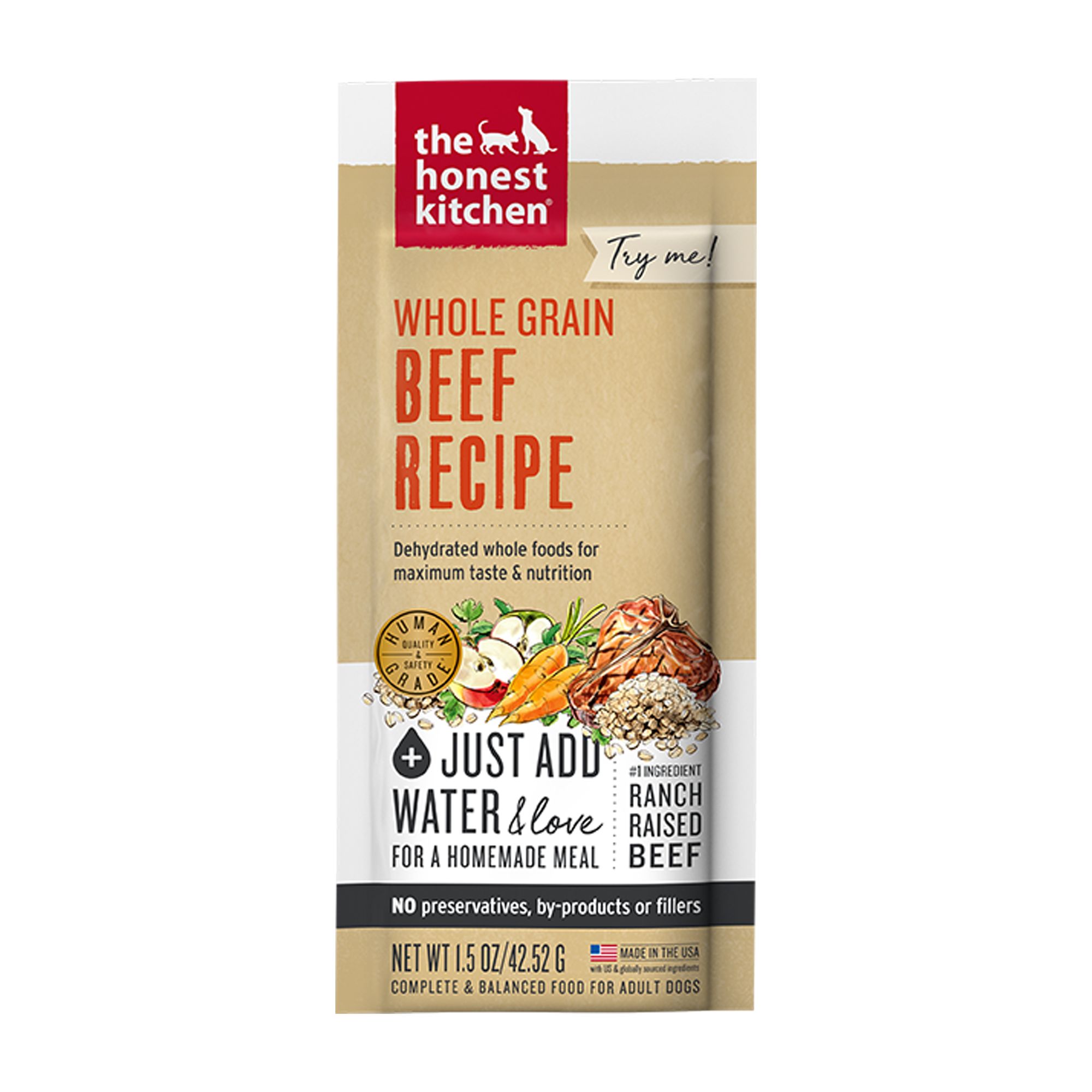 REAL FOOD WITHOUT THE HASSLE Real ingredients, gently dehydrated to preserve flavor and nutrition, offering a shelf–stable, affordable alternative to fresh, raw, homemade, and freeze–dried dog food.MAKES 3⁄4 CUP PER SACHET Just add water to make up to 3⁄4 cup of real food that's perfect for giving your dog their first taste of dehydrated, as a healthy topper, paired with a lick mat or enrichment toy, or for travel. FOR PUPPIES & ADULT DOGS Suitable for adult dogs and puppies of all breeds and sizes, including large breed puppies and adult mothers (gestation/lactation).HUMAN GRADE Crafted with high–quality, human grade ingredients and produced to the same standards of quality and safety as the food you eat.MADE IN THE USA Proudly made in the USA with ingredients sourced from trusted suppliers around the world.Species: Dog