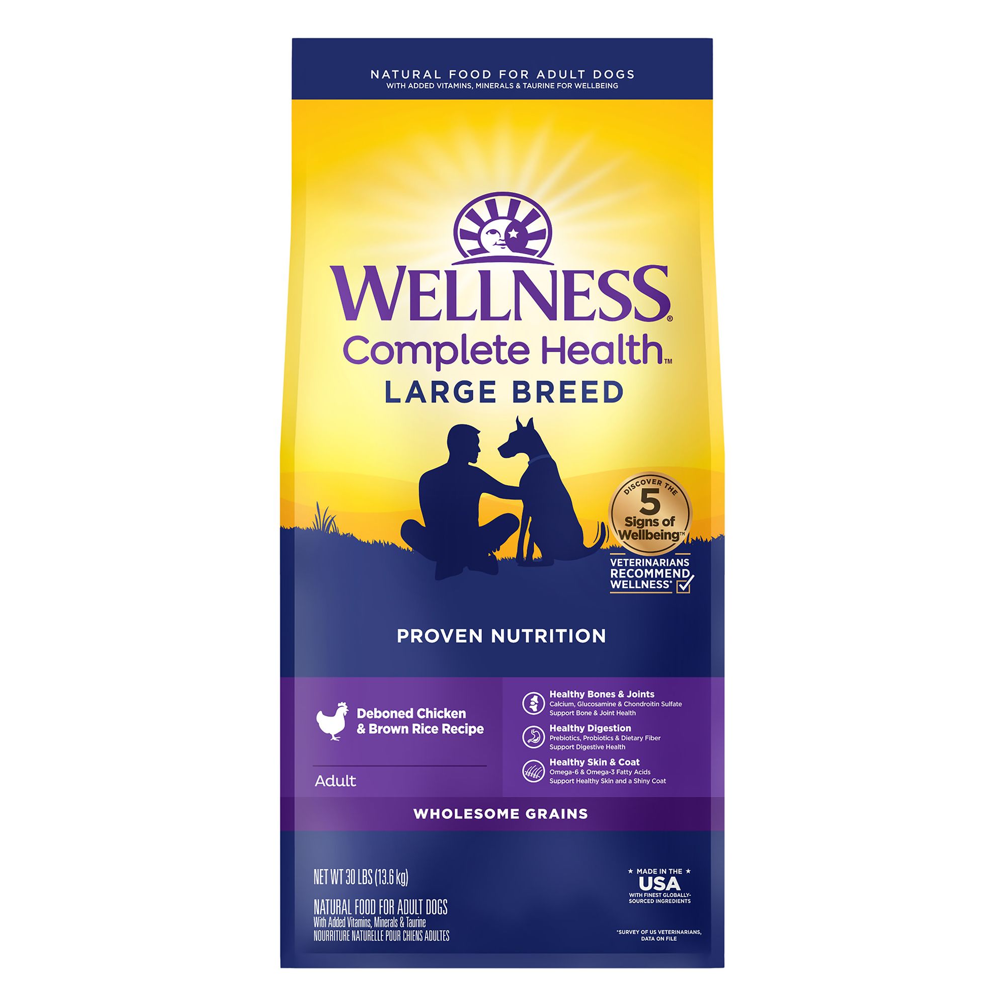 Wellness Complete Health natural pet food is made with carefully chosen, authentic ingredients for everyday health. A nutrient-rich blend of whole foods to fulfill the unique health needs of your dog, providing whole-body nutritional support to promote complete health. Supported by omega fatty acids, antioxidants, glucosamine, probiotics and taurine for a healthy heart. Scientifically crafted by our team of veterinarians and scientists to provide nutrition for a lifetime of well-being. Easily add our food to your dog food storage container for a fresh scoop of dog food every time. Your small dog, large dog, senior dog, adult dog or puppy will love our tasty grained and grain free dog food options. We produce our high protein dog food with globally sourced ingredients. Whether you're looking for beef dog food, lamb dog food, chicken dog food, salmon dog food, or whitefish dog food, there is a recipe for you! Try our entire portfolio of high quality dog food today.