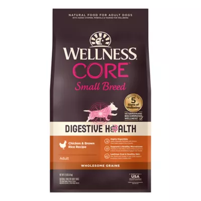 DIGESTIVE HEALTH SMALL BREED ADULT DRY DOG FOOD: This highly digestible, probiotic–coated dog kibble is made with digestive enzymes, a blend of prebiotic fibers, and guaranteed levels of probiotics to support gut health for overall wellbeing and vitality.
