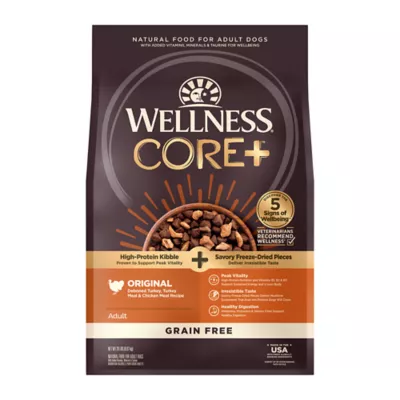GRAIN–FREE ADULT DRY DOG FOOD: Protein packed, nutrient dense kibble combined with 100% raw freeze–dried turkey pieces for a crave worthy savory dog food; with optimal protein levels, high fiber and calorie content your dog needs to thrive.