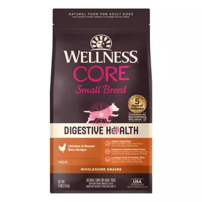 DIGESTIVE HEALTH SMALL BREED ADULT DRY DOG FOOD: This highly digestible, probiotic–coated dog kibble is made with digestive enzymes, a blend of prebiotic fibers, and guaranteed levels of probiotics to support gut health for overall wellbeing and vitality.