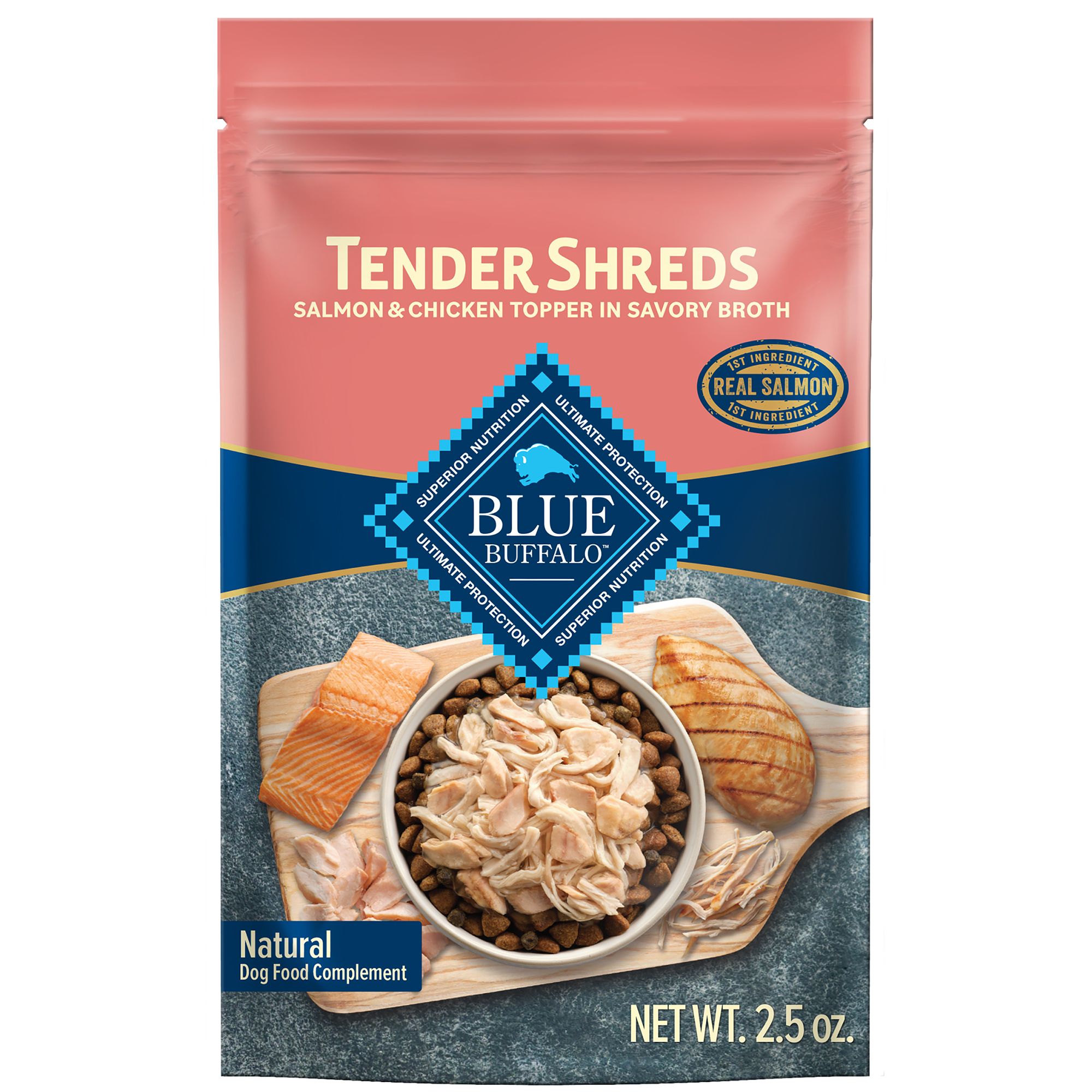 Make every meal magnificent with Blue Buffalo Tender Shreds Tasty Chicken Toppers, perfectly portioned dog food toppers that add an irresistible, home-cooked touch to your dog's favorite dry food - with a succulent taste and texture just like from the slow cooker! This simple, natural recipe features tender pieces of real pulled chicken in a savory broth for a homestyle dining experience your pup will love. Plus, Tender Shreds add extra protein and moisture to your dogâs diet. Add Tender Shreds to your dog's favorite dry food or give as a snack or treat for rewarding moments between mealtimes. Blue Buffalo Tender Shreds are backed by the True BLUE Promise and always start with real, high-quality meat, poultry, or fish. They contain no chicken or poultry by-product meals, no corn, wheat, or soy, and no artificial flavors or preservatives. Blue Buffalo Tender Shreds Tasty Chicken Toppers are intended for intermittent or supplemental feeding only andshould be fed along with a complete and balanced diet. BLUE Tender Shreds are brought to you by Blue Buffalo, the leader in natural pet food. Love them like family. Feed them like family.