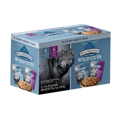 Treat your dog's wild side with BLUE Wilderness Trail Toppers Wild Cuts Natural Wet Dog Food Variety Pack Made with high-quality chicken or beef as the first ingredient; this grain-free wet dog food provides a delicious taste and the nutrients your dog needs to stay active; Mix these meal toppers into your dog's dry food for added flavor; or serve as a tasty treat between meals And like all Blue Buffalo natural dog food recipes; BLUE Wilderness wet dog food toppers do not contain any chicken or poultry by-product meals. They are also free of corn; wheat soy; artificial flavors; and preservatives.