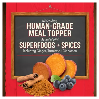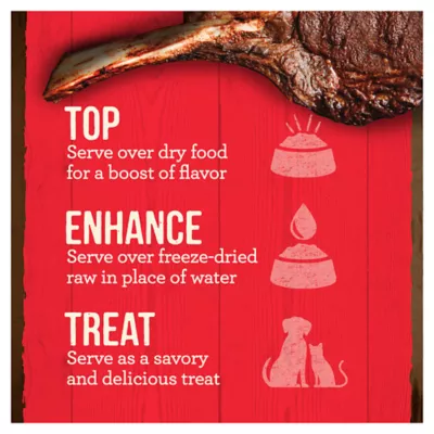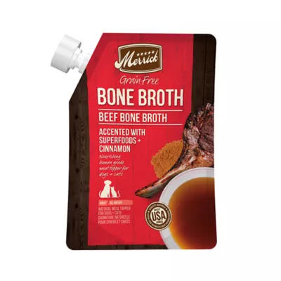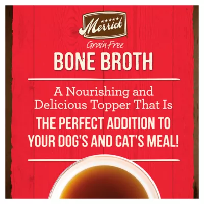 Increase moisture in your dog's and cat's diets with Merrick Grain Free Beef Bone Broth added as a dog food topper and cat food broth to your pet's bowl. This natural dog food and natural cat food is a human grade meal topper that adds extra moisture and flavor to your pet's diet. Now available for cats, this cat bone broth topper is accented with superfoods and unique spices including cinnamon, turmeric and ginger. This grain free beef bone broth meal mixers for dogs and cats can be used as a sensitive stomach dog food topper. Serve beef bone broth Merrick dog treats on top of dry natural dog food, as a savory dog treat or mixed with freeze dried raw bits in place of water as a savory beef meal mixer for dogs. Merrick bone broth was proudly founded in Hereford, Texas.