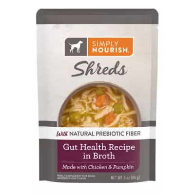 Simply Nourish Natural Solutions Meal Topper Gut Health Recipe Shreds in Broth Meal Complement for Dogs makes any mela better. These shreds in broth are made with chicken and pumpkin, and feature natural prebiotic fiber to promote good gut health. Only at PetSmart.