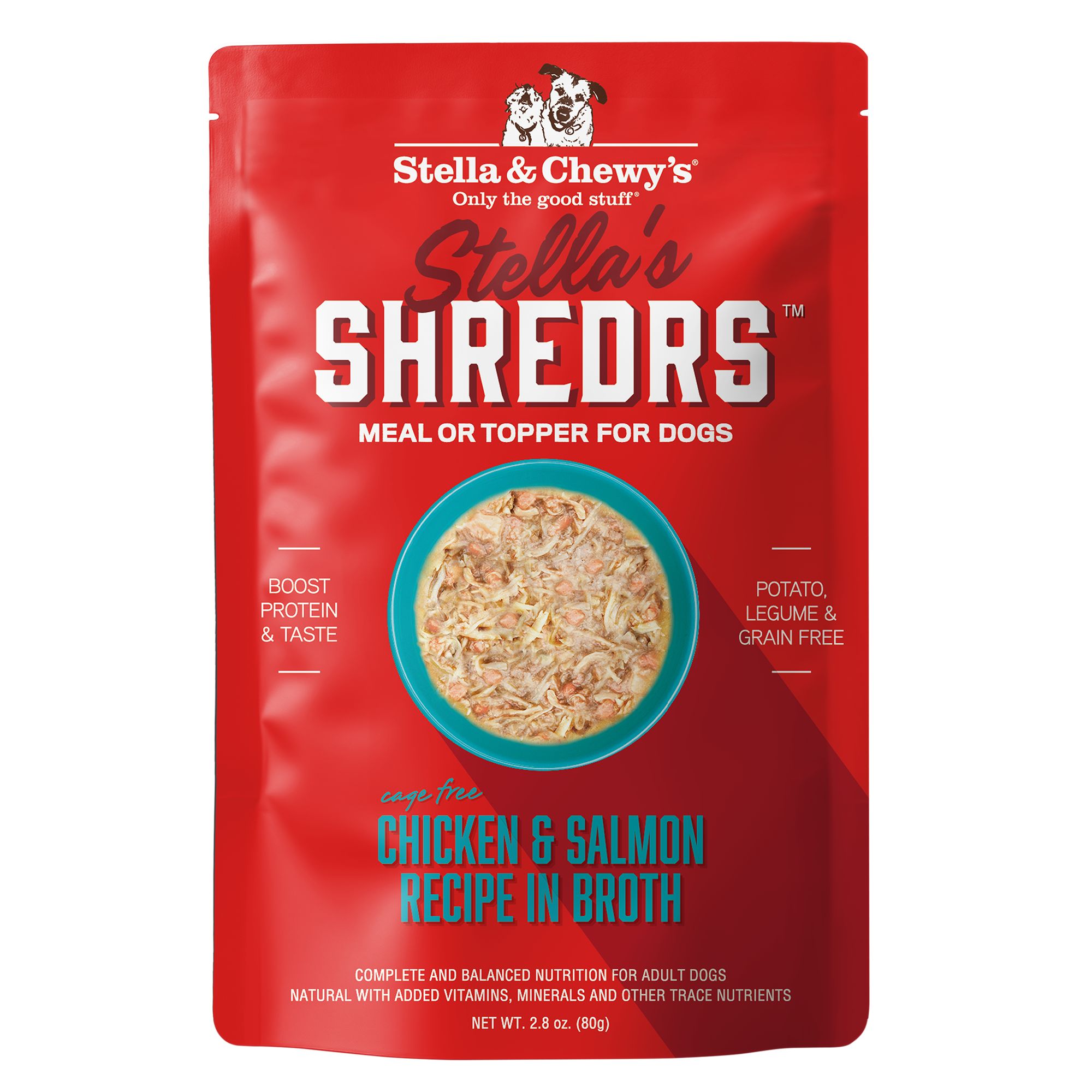 Features & Benefits: Kickstart your dog's dinner with Stella's Shredrs – a delicious and nutritious way to make mealtime special. Real shredded muscle meat and diced meat in a slowly simmered broth. A boost of extra protein and taste